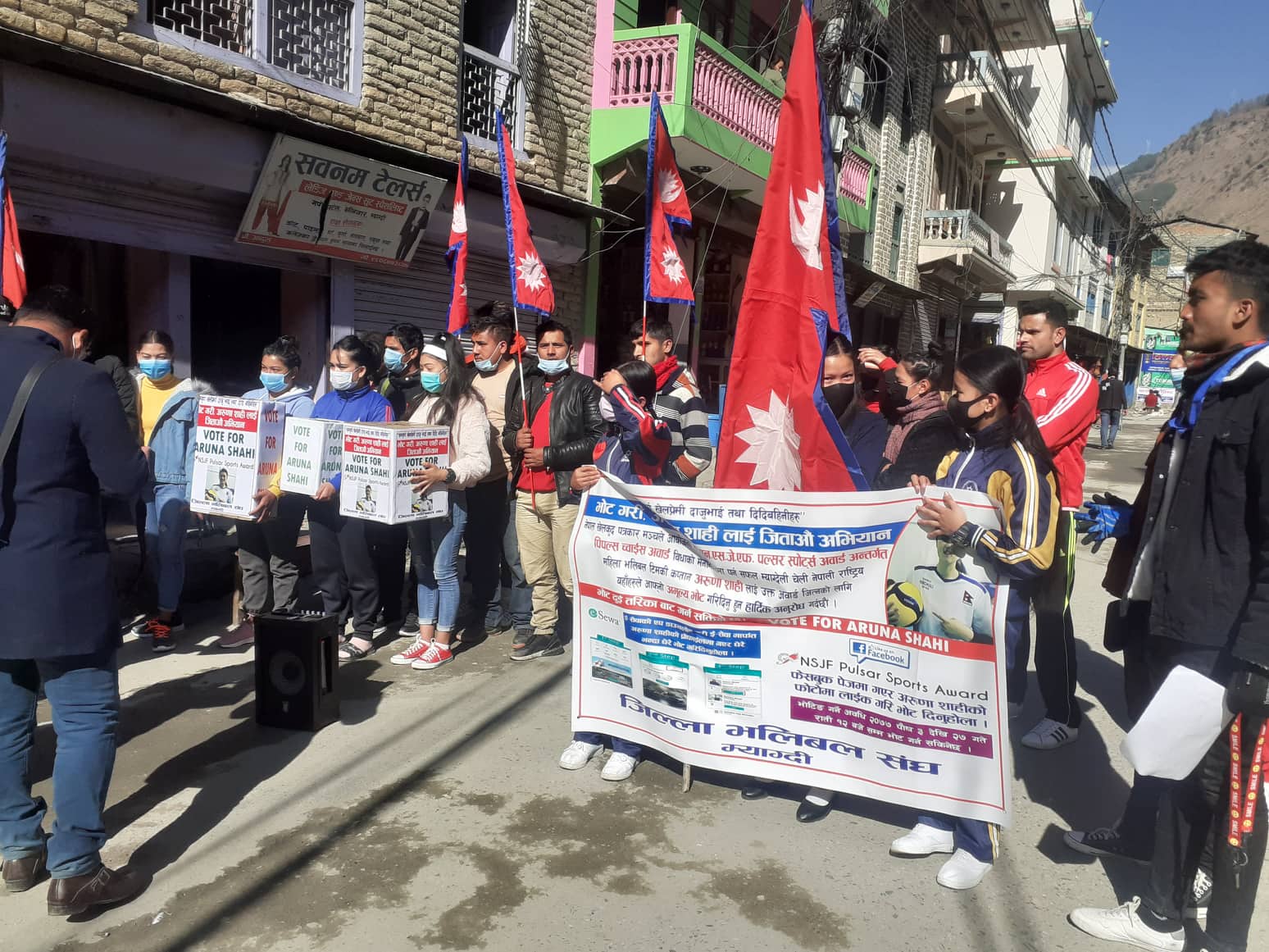 म्याग्दी, १७ पुस । नेपाल खेलकुद पत्रकार मञ्चको पिपुल्स च्वाइस अवार्डको मनोनयनमा परेकी राष्ट्रिय महिला भलिबल टोलीकी कप्तान अरुणा शाहीलाई बिजयी गराउने अभियान म्याग्दीमा सुरु भएको छ । जिल्ला भलिबल संघ म्याग्दीले शाहीलाई विजेता बनाउन बिहिबारदेखि घरदैलो सहित अभियानको सुरुवात गरेको हो ।