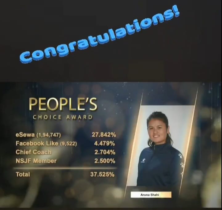 ललितपुरको सातदोबाटोस्थित कराते हलमा मंगलबार आयोजना भएको अवार्ड कार्यक्रममा अरुणाले पिपल्स च्वाइस अवार्ड हात पारेकी हुन् । जनताको मत तथा राष्ट्रिय खेल संघका मुख्य प्रशिक्षक र नेपाल खेलकुद पत्रकार मञ्चका सदस्यको मतबाट अरुणाले अवार्ड जितेकी हुन् ।