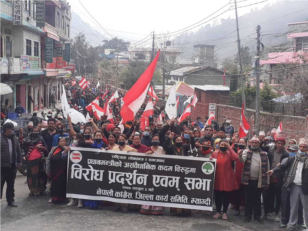 म्याग्दी, ३ फागुन । प्रधानमन्त्रीको असंवैधानिक कदम विरुद्ध नेपाली काग्रेसले बेनीमा विरोध प्रर्दशन एवम् सभा गरेको छ । संगमचोक पाटी कार्यालयबाट सुरु गरिएकोे विरोध प्रर्दशन जिल्ला प्रशासन कार्यालय अगाडी विरेन्द्रचोकमा सभामा परिणत गर्दै सरकारको आलोचना गरेका थिए ।