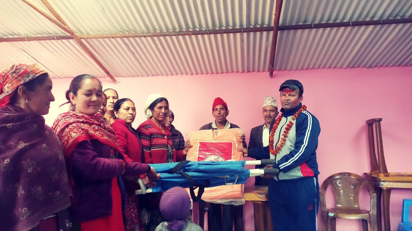 बेनीस्थित झोलुङ्गेपुलमा गजेन्द्र फेन्शी स्टोर्शका संचालक भण्डारीले आपतकालिन रुपमा गाउँमा हुने विरामीलाई सहज रुपमा बोकेर हस्पितलसम्म पु¥याउनका लागि फोल्डिङ स्टेचर र विवाह बत्तवन्ध तथा सार्वजनिक काममा आवश्यक पर्ने पाल आमासमुहलाई उपलब्ध गराएका हुन् ।