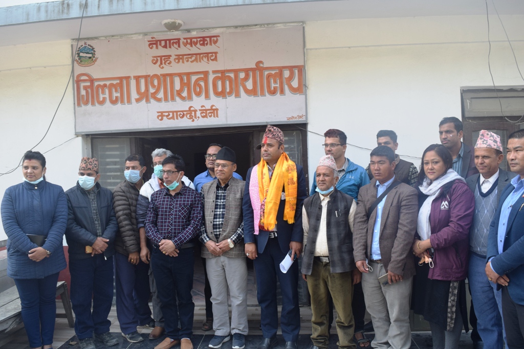 संविधान सभा सदस्य नेकपा म्याग्दीका अध्यक्ष गोविन्द्र पौडेल, जिल्ला समन्वय समितिका प्रमुख देवेन्द्र कटुवाल, बेनी नगरपालिका मेयर हरीकुमार श्रेष्ठ, गाउँपालिकाका उपाध्यक्ष, सुरक्षा कर्मी प्रशासकीय प्रमुख लगायतको कर्मचारी र पत्रकार उपस्थित भएको कार्यक्तममा जिल्लाको विकास, कोरना नियन्त्रणमा र बाढी पीडितलाई सहयोग तथा पुर्नबास निर्माणमा बढी लागि परेको बताए ।