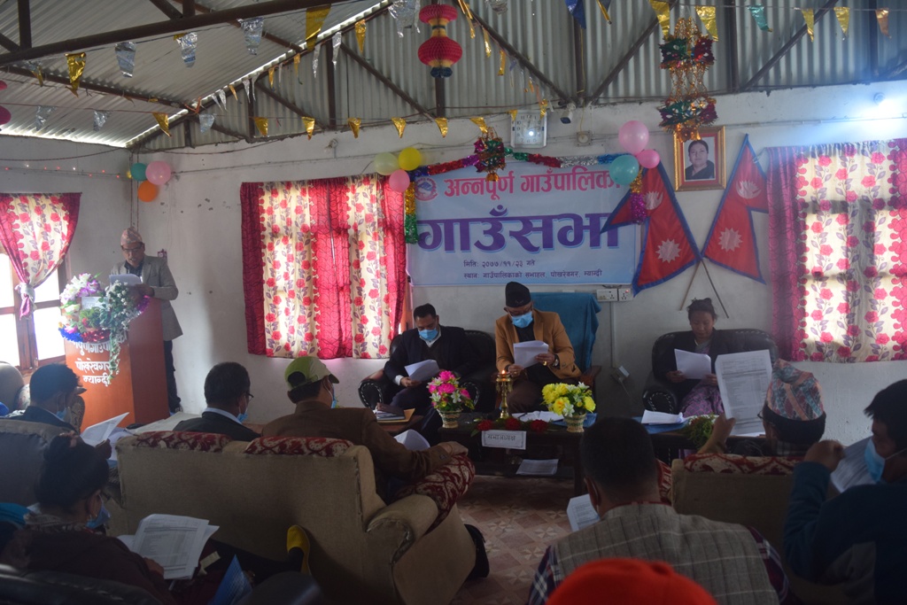 म्याग्दी २३ फागुन । म्याग्दीको अन्नपूर्ण गाउँपालिकाको गाउँसभा आइतबार पोखरेबगरमा सम्पन्न भएको छ । चालु आर्थिक वर्षको योजना तथा बजेट संसोधन, शिक्षा र वातावरण सम्बन्धी बिधेयक पारित गरेको गाउँसभामा गाउँपालिका र वडा बिभाजन गर्ने प्रस्ताव पेश भएको छ ।