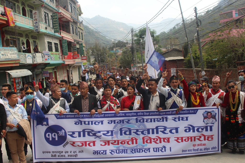 म्याग्दी, २७ फागुन । म्याग्दीको सदरमुकाम बेनीमा नेपाल मगर विद्यार्थी संघको एघारौ राष्ट्रिय विस्तारित भेला आजदेखि सुरु भएको छ। देशभरबाट आएका मगर विद्यार्थीहरुको राष्ट्रिय भेलाको अवसरमा बेनीमा झाँकी सहितको ¥याली निकालिएको छ ।