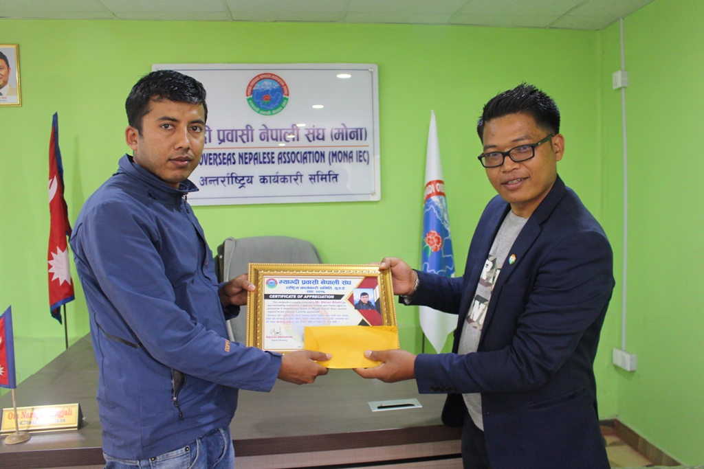 सञ्चार माध्यममा रहेर विश्वमा रहेका नेपालीमाझँ जिल्लाको गतिविधि सम्पे्रषण गर्दै आएका पत्रकारद्धय खत्रीलाई सम्मान गरिएको मोना युएइका अध्यक्ष राम्जालीले बताउनुभयो । मोना युएईको कार्यसमितिको प्रथम बैठकबाट हरेक बर्ष जिल्लामा बसेर पत्रकारीता गर्ने दुईजना पत्रकारलाई सम्म्मान गर्ने निर्णय अनुसार पत्रकारद्धयलाई सम्मान गरिएको थियो ।