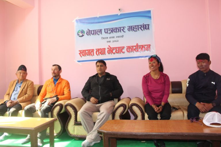 म्याग्दी, ६ बैशाख । अन्नपुर्ण हिमालको सफल आरोहण गरेर किर्तिमानी बनाएकी पत्रकार पुुर्णिमा श्रेष्ठको टोलीलाई म्याग्दीमा सम्मान गरिएको छ। म्याग्दीको अन्नुर्ण गाउँपालिका – ४ नारच्याङमा अवस्थित ८ हजार ९१ मिटर अग्लोअन्नपुर्ण हिमालको चुचरोमा पुग्ने पहिलो महिला पुुर्णिमा श्रेष्ठलाई अन्नपुर्ण गाउँपालिका, नारच्याङबासी र नेपाल पत्रकार महासंघ म्याग्दीले बेनीमा सम्मान गरेको हो । श्रेष्ठसहित पेम्वा शेर्पा, पोल्याण्डका यारोलाई सम्मान गरिएको थियो ।
