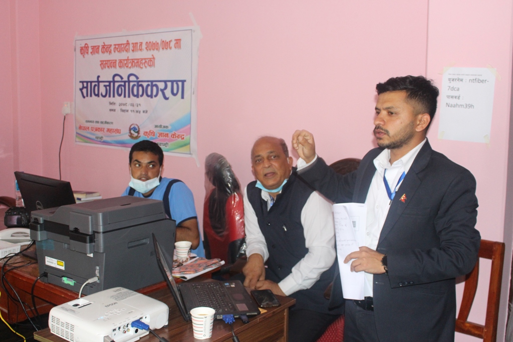 म्याग्दी, १ साउन । कृषि ज्ञान केन्द्र म्याग्दीले आर्थिक बर्ष २०७७÷७८ को बार्षिक कार्यक्रमको प्रगति र खर्च विवरण सार्वजनिक गरेको छ । केन्द्रले साना ब्यवसायिक फर्म तरकारी, यान्त्रीकरण, किबी, मौरी, फलफुल, च्याउ, आलु, धान लगायतको खेतीबाट कृषकलाई आत्मनिर्भर र ब्यवसायीक बनाउने कार्यक्रमको उपलब्धी र बार्षिक खर्च सार्वजनिक गरेको हो ।