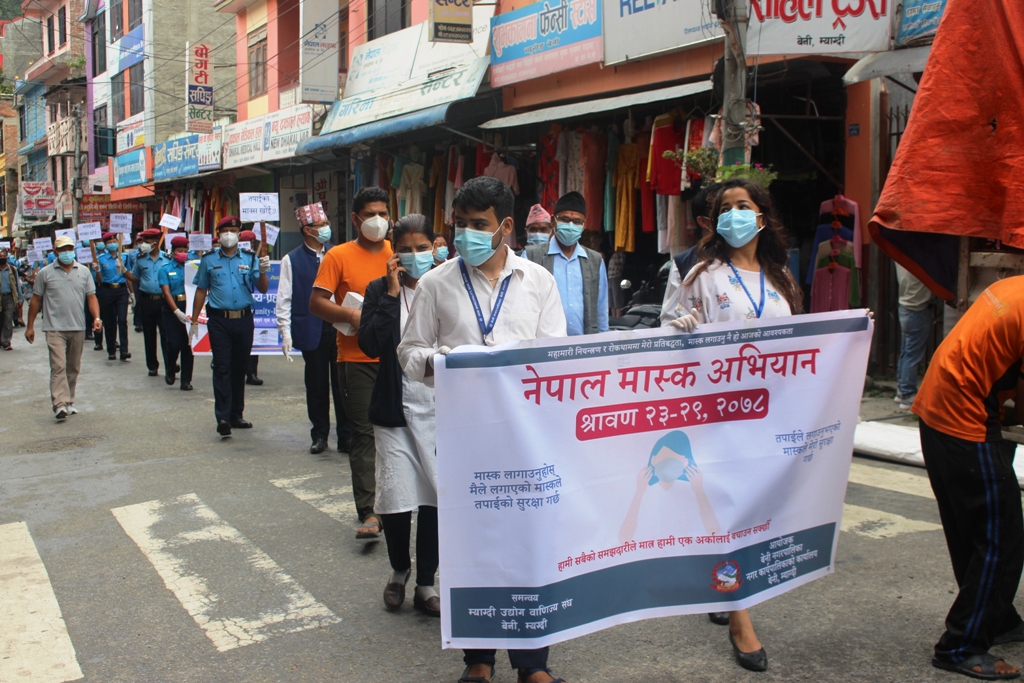 तपाईंको माक्स खै भन्दै सदरमुकाम बेनी परिक्रमा गर्दैै ब्यापारी, संर्वसाधारणलाई अनिवार्य मास्क लगाउन अपिल गरिएको र स्वास्थ्य मापदण्ड पालना गरी ब्यापार ब्यवसाय गर्न आग्रह गरिएको म्याग्दी उद्योग वाणिज्य संघका अध्यक्ष बेलबहादुर कटुवालले बताए । स्वास्थ्य कार्यालय म्याग्दीको तथ्यांकअनुसार हालसम्म जिल्लामा २ हजार ९४० जना कोरोना संक्रमित भेटिएका छन् । भने संक्रिय संक्रमित १२० जना रहेका छन् ।