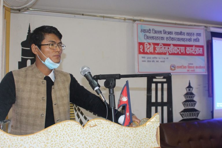 बेनी, १४ कात्तिक । म्याग्दीको स्थानीय तहमा महिला तथा बालबालिका क्षेत्रमा काम गर्ने कर्मचारीलाई दुई दिने अभिमुखीकरण कार्यक्रम संचालन गरिएको छ। सामाजिक विकास कार्यालय म्याग्दीले महिला तथा बालबालिका क्षेत्रका कार्यरत कर्मचारीको क्षमता बृद्धि गर्नका लागि कात्तिक १४ र १५ गते अभिमुखीकरण तालिम संचालन गरिएको हो ।