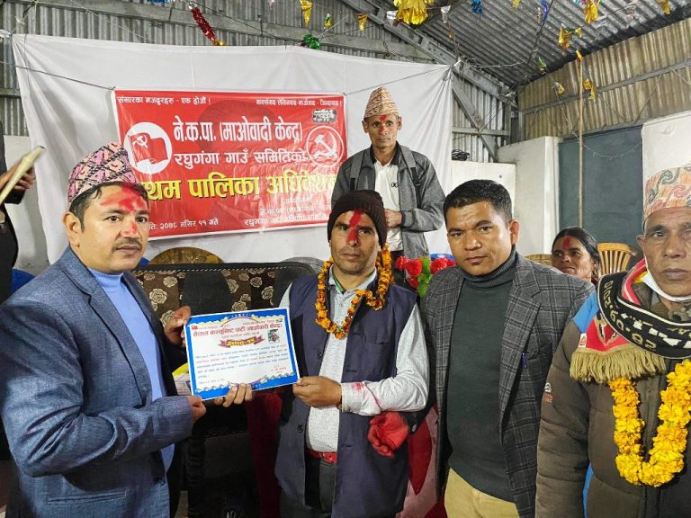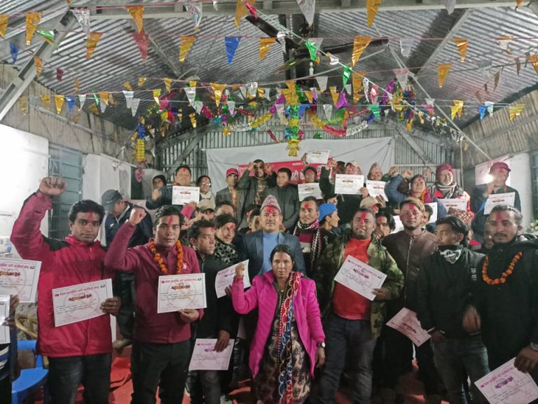 कमिटीको उपाध्यक्षमा टेककुमारी खत्री, इन्द्रबहादुर मगर, सुनिल सुनार, सचिबमा भविन्द्र शेरपुञ्जा, सह-सचिबमा कणर् राना निर्वाचित हुनुभएको निर्वाचन अधिकृत श्रीकृष्ण रिजालले जानकारी दिनुभयो । निर्वाचन अधिकृत रिजाल, ज्येष्ठ कम्युनिष्ट नेता शालिकराम रिजाल, नेकपा माओवादीका रघुगंगा इन्चार्ज रिम कटुवाल लगायतले नवनिर्वाचित पदाधिकारी र सदस्यहरुलाई अविर, माला लगाएर प्रमाणपत्र प्रदान गर्नुभएको थियो ।