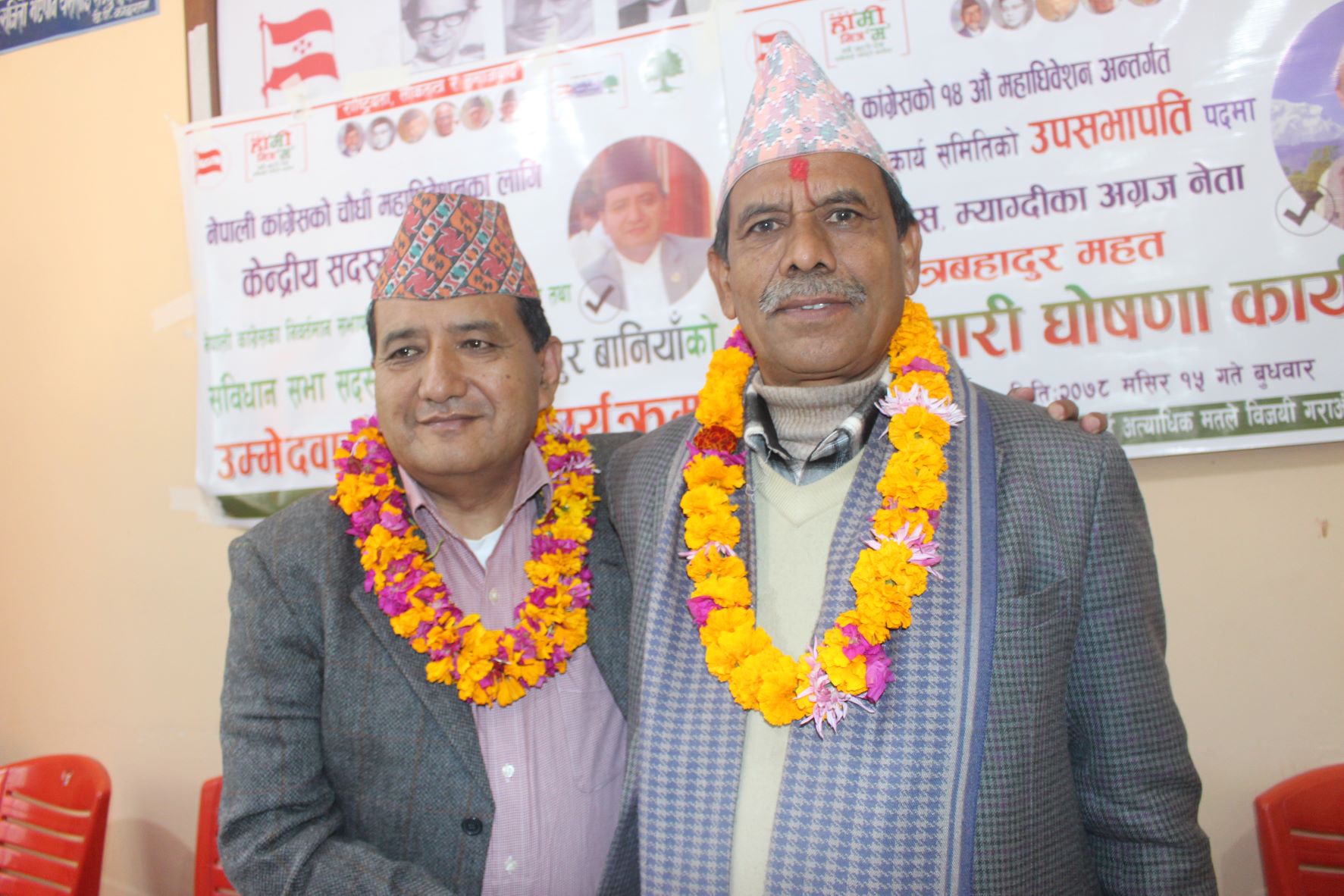 नेपाली कांग्रेस म्याग्दीको पाटी कार्यालयमा बुधवार आयोजित पत्रकार सम्मेलनमा नेताद्धयलाई काँग्रेस म्याग्दीको तर्फबाट साझा उम्मेदवारको रुपमा घोषणा गरिएको थियो । जिल्ला अधिवेशनबाट महाधिवेशन प्रतिनिधिमा निर्वाचित हुनुभएका नेताद्धय बानियाँ र महतले म्याग्दीबाट प्रदेश र केन्द्रीय समितिमा प्रतिनिधित्वका लागि आफुहरुले उम्मेदवारी दिन लागेको बताउनुभएको थियो ।
