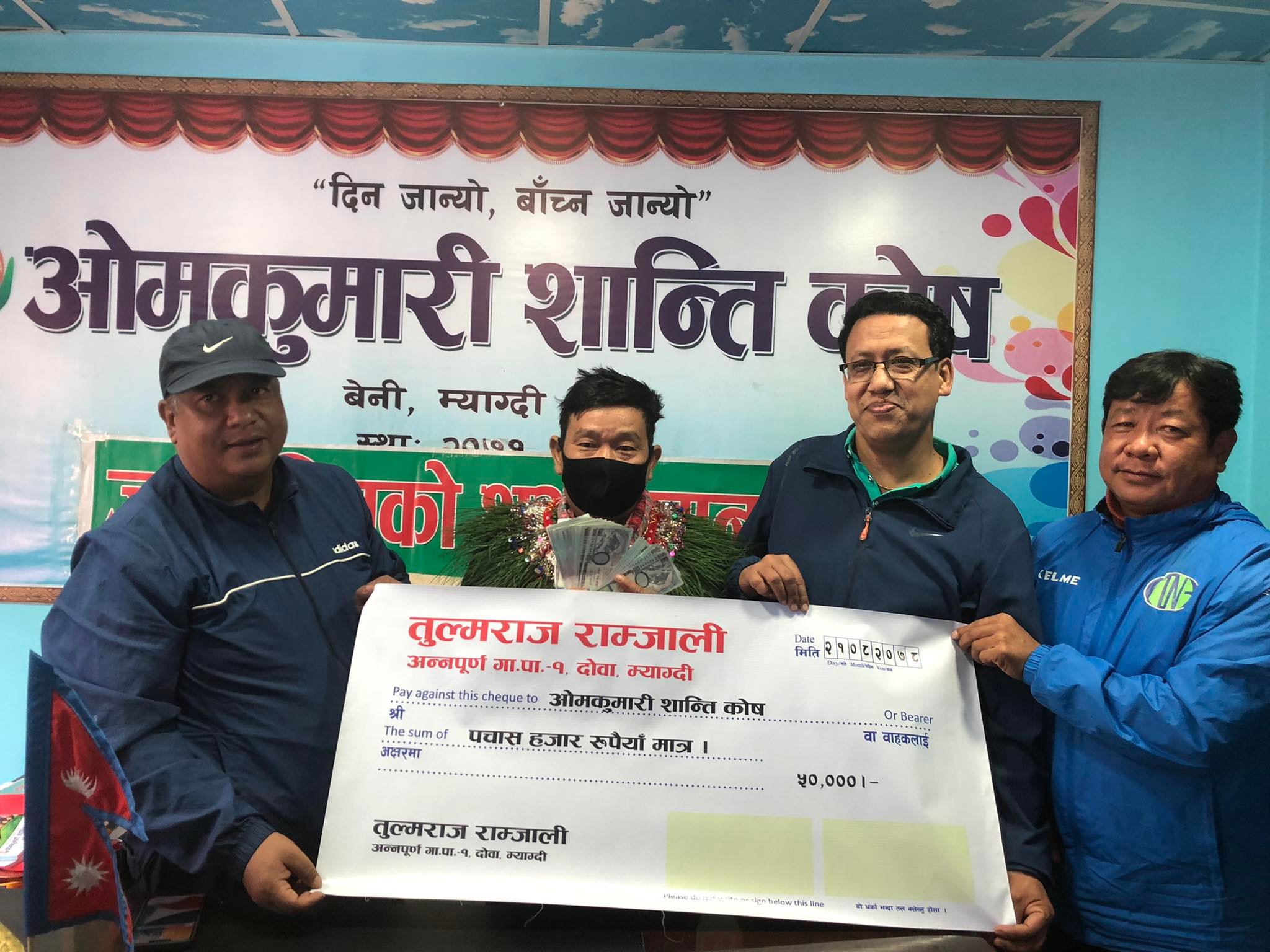 बेनी, २१ म्ंसिर । म्याग्दीका एक ब्यक्तिले जन्मदिनको अवसरमा म्याग्दीको परोपकारी संस्था ओमकुमारी शान्ति कोषलाई सहयोग गरी मनाएका छन् । म्याग्दीको अन्नपूणर् गाउँपालिका वडा नं १ दोवाका तुल्मराज राम्जालीले विपन्नको उपचारमा सहयोग गर्ने गरी कोषलाई ५० हजार सहयोग कोषका अध्यक्ष राजेश शाक्य र कोषाध्यक्ष विनय श्रेष्ठलाई हस्तान्तरण गरेका हुन् ।