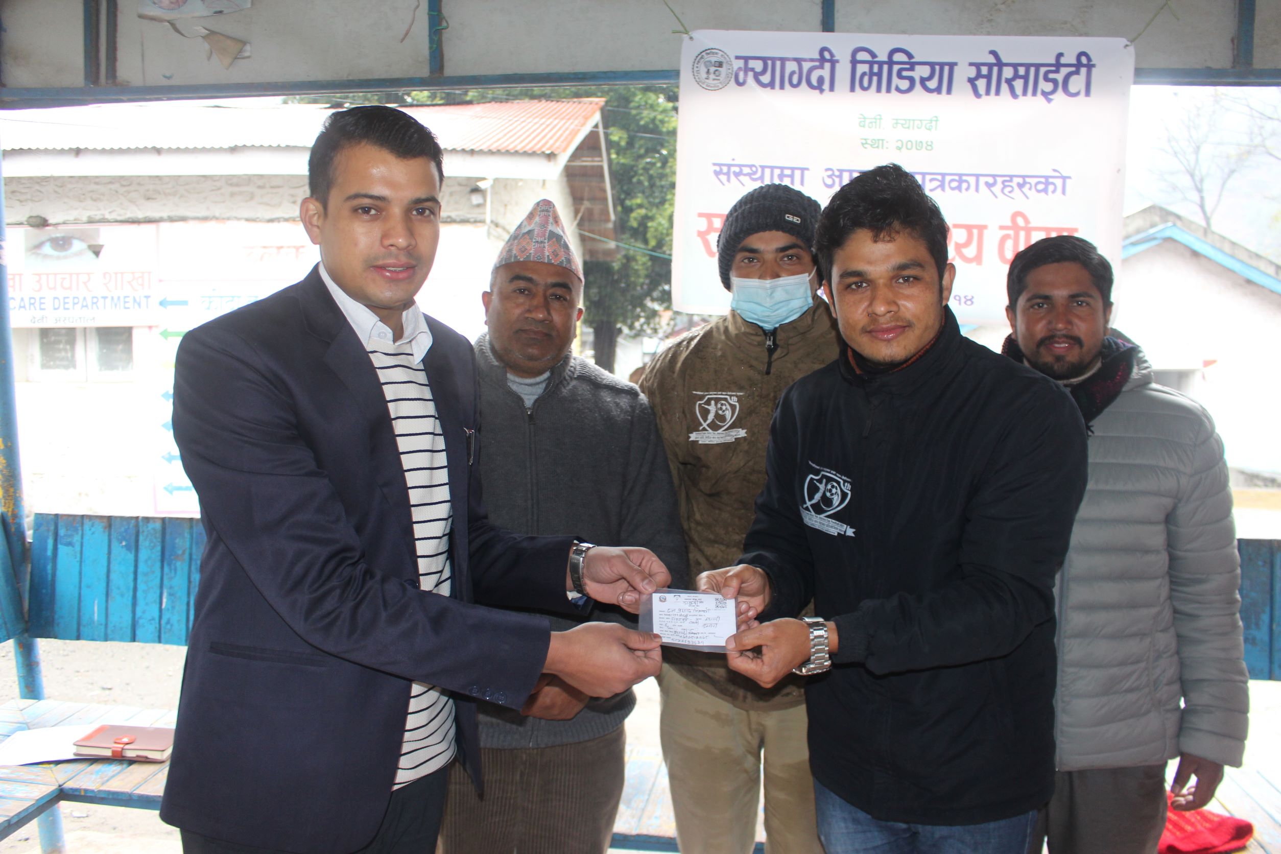 म्याग्दी, १४ पुस । म्याग्दी मिडिया सोसाईटीले जिल्लाका १० जना पत्रकारहरुको सामूहिक स्वास्थ्य बीमा गरेको छ । सोसाईटीको संस्थागत निर्णय अनुसार, संस्थामा आबद्ध पत्रकारहरुको एक बर्षको लागि स्वास्थ्य बीमा गरिएको हो । संस्थामा आबद्ध १० जना पत्रकारहरुको स्वास्थ्य बीमाका लागि लाग्ने जनही नगद रु ३ हजार ५ सय शुल्क तिरेर स्वास्थ्य बीमा गरिएको संस्थाका सचिब अमित विश्वकर्माले जानकारी दिए । बुधवार बेनी अस्पताल परिसरमा आयोजित कार्यक्रममा बेनी अस्पतालका मेडिकल सुपरिटेण्डेन्ट डाक्टर जितेन्द्र कँडेल, स्वास्थ्य बीमा बोर्ड म्याग्दीका कार्यालय प्रमुख उपेन्द्र बराल, बेनी अस्पताल व्यवस्थापन समितिका अध्यक्ष बेलबहादुर कटुवाल र सोसाईटीका अध्यक्ष कमल खत्रीले स्वास्थ्य बीमाको परिचयपत्र प्रदान गरेका थिए ।