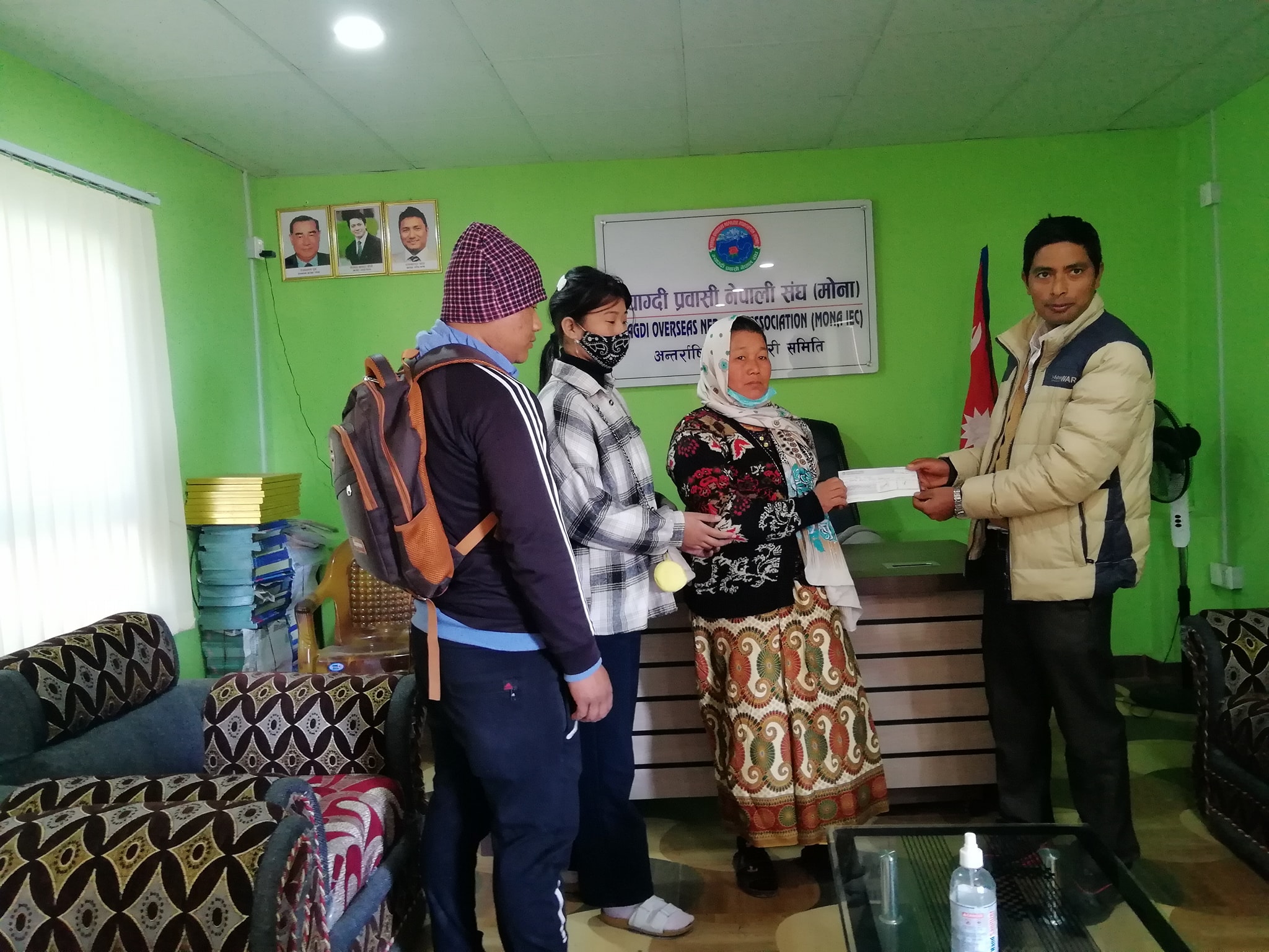 घरमुलीको प्रवासमै निधन भएको र आम्दानीको स्रोत गुमेपछि घरपरिवारको राहतका लागि मोना अन्तराष्ट्रियको बैठकबाट सहयोग उपलब्ध गराउने निर्णय भए बमोजिम उक्त सहयोग हस्तान्तरण गरिएको सचिब बरुवालले बताए ।