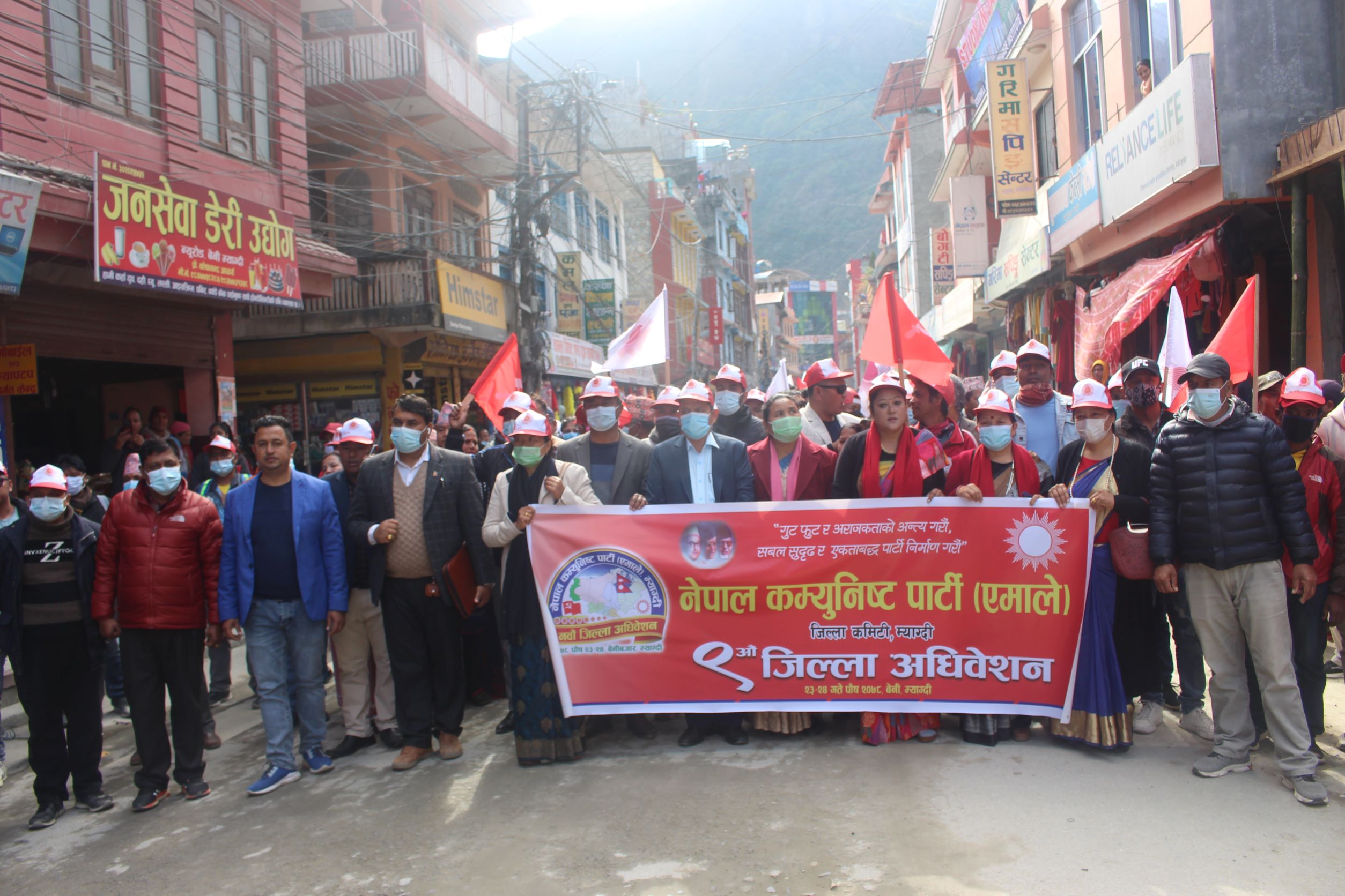 म्याग्दी, २३ पुस । नेकपा एमाले म्याग्दीको नवौँ अधिवेशन सुरु भएको छ । जिसस सभाहलमा हुने अधिवेशन पुर्व बाजागाजासहित प्रतिनिधि र कार्यकताहरुले बेनी बजारमा ¥याली गरेका छन् । नयाँ नेतृत्व चयनका लागि हुने अधिवेशनमा ५१० जना प्रतिनिधि सहभागि भएका छन् ।