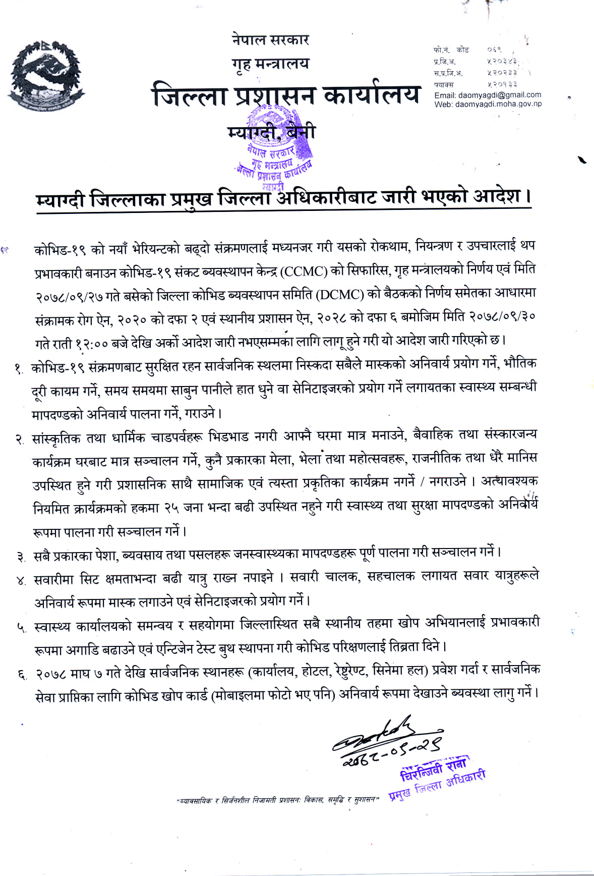विभिन्न पेशा र ब्यवसाय तथा पसलहरुमा ब्यवसायीले जनस्वास्थ्यका मापदण्डहरु पुस ३० गते शुक्रबार देखि अनिवार्य पालना निर्देशन छ । यातायात ब्यवसायीले क्षमताभन्दा बढी यात्रु नराखी मास्क र सेनिटाईजर अनिवार्य प्रयोग गर्नुपर्ने विज्ञप्तीमा उल्लेख छ ।