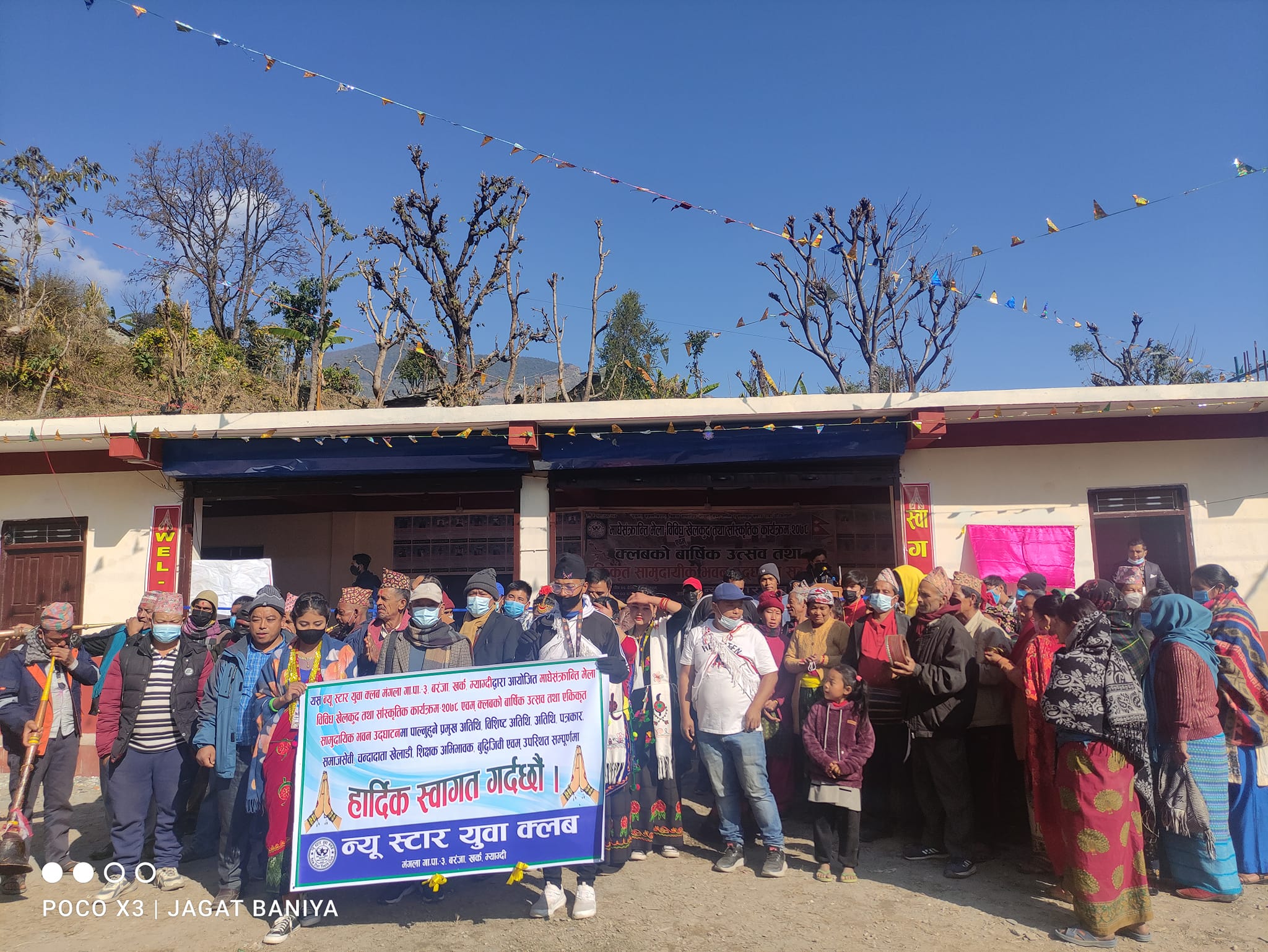 म्याग्दी, ४ माघ । म्याग्दीको मंगला गाउँपालिका–३ खर्कमा एकिकृत सामुदायिक भवन र खेलमैदान निर्माण भएको छ । मंगला गाउँपालिका र गण्डकी प्रदेश सरकारको सहयोगमा न्यु स्टार युवा क्लबले खेलमैदानसँगै एकिकृत सामुदायिक भवन निर्माण गरेको हो । क्लबका अध्यक्ष राजु थापाले पालिका र प्रदेश सरकारको रु. ३२ लाख अनुदान सहयोग तथा स्थानीयको रु. तीन लाख ९० हजार बराबरको श्रमदानबाट भवन निर्माण गरिएको जानकारी दिनुभयो ।