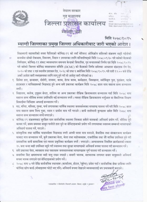 म्याग्दी, १५ माघ । कोरोना (भाइरस) को संक्रमण तिब्र रुपमा फैलिएपछि म्याग्दीका म्याग्दीका शैक्षिक संस्था आगामी माघ मसान्तसम्म बन्द गर्नेे निर्णय भएको छ । शनिबार भर्चुअलबाट बसेको कोभिड–१९ जिल्ला संकट ब्यवस्थापन केन्द्रको बैठकले आगामी माघ मसान्तसम्म भौतिक उपस्थितिमा पठनपाठन नगर्न निर्देशन जारी गरेको हो ।