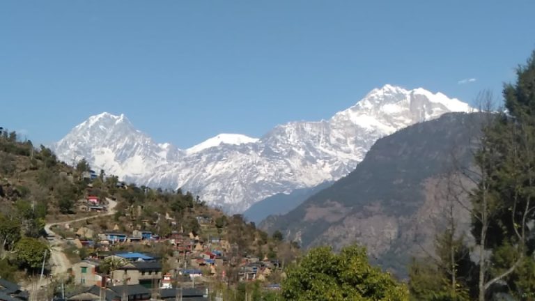 भगवती, २३ माघ । म्याग्दीको रघुगंगा गाउँपालिका वडा नम्बर २ राखु भगवतिबाट पृष्ठभूमिमा देखिएको निलगिरी र अन्नपूर्ण हिमाल । धौलागिरी आईसफल अन्तरगत धार्मिक पर्यटकियस्थल भगवती कोतमन्दिरबाट राखुको हटिया गाउँसगै नीलगिरी र अन्नपुर्ण हिमालको अवलोकन गर्न सकिन्छ । तस्विर : धिरन खत्री