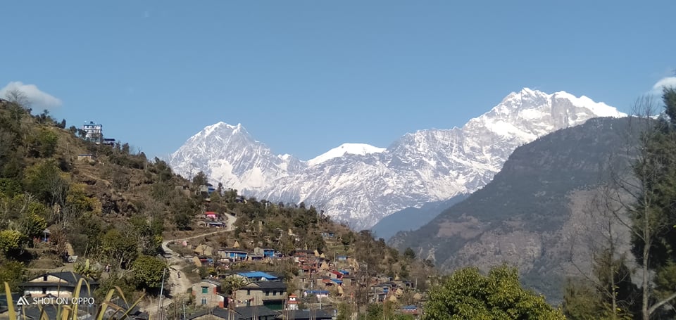 भगवती, २३ माघ । म्याग्दीको रघुगंगा गाउँपालिका वडा नम्बर २ राखु भगवतिबाट पृष्ठभूमिमा देखिएको निलगिरी र अन्नपूर्ण हिमाल । धौलागिरी आईसफल अन्तरगत धार्मिक पर्यटकियस्थल भगवती कोतमन्दिरबाट राखुको हटिया गाउँसगै नीलगिरी र अन्नपुर्ण हिमालको अवलोकन गर्न सकिन्छ । तस्विर : धिरन खत्री