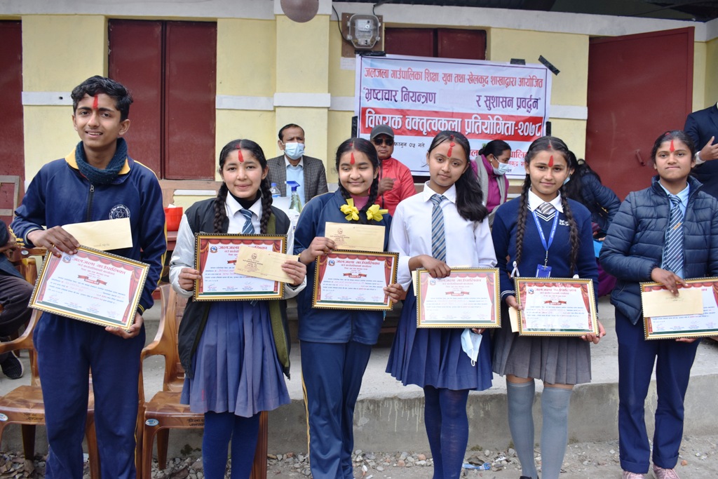 विभिन्न सृजनात्मक कार्यक्रमहरु मार्फत बालबालिकाको आफ्नो क्षमतालाई बाहिर प्रस्फुटन गराउन तर्फ सम्बन्धित निकाय तथा अविभावकहरुले समेत ध्यान दिनुपर्नेमा उहाँले जोड दिनुभयो । भ्रष्टाचार र शुसासन प्रवद्र्धनका विषयमा विद्यार्थीहरुलाई जागरुक गराउने तथा यस विषयमा स्थानीयस्तरबाटै अध्ययन तथा खोजी होस् भन्ने उद्देश्यले प्रतियोगिताको आयोजना गरिएको निमित्त प्रमुख प्रशासकीय अधिकृत सुनारले बताउनुभयो ।