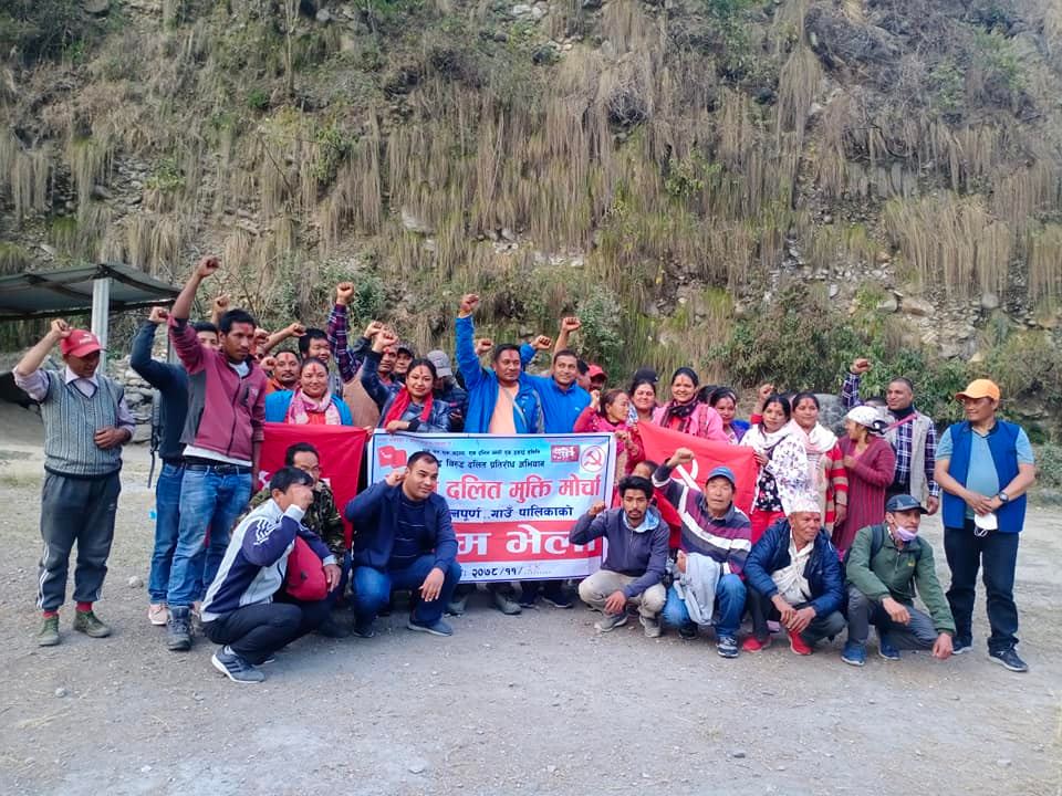 मोर्चाको भेलालाई सम्वोधन गर्दै नेकपा माओवादी केन्द्र नेता एवम् नेपाल दलित मुक्ति मोर्चा गण्डकी प्रदेशका इन्चार्ज टेकबहादुर विकले माओवादीकै जनयुद्धको कारण दलितहरुको हक हित र अधिकार संविधानमा सुनिश्चित भएकोे बताउनुभयो । उहाँले दलित, महिला, जनजाति, अल्पसंख्यक, पछाडी परेका समुदायको उत्थान र सशक्तिकरणमा माओवादीले जति योगदान कुनैपनि दलले नगरेको बताउदै सशक्त रुपमा हरेक तहको नेतृत्वमा पुग्ने गरी क्षमता विकास गर्न उपस्थितलाई आग्रह गर्नुभयो । उहाँले स्थानीय तहमा माओवादीकै नेतृत्व स्थापित गराउन आगामी बैशाख ३० हुने निर्वाचनलाई ध्यानमा राखेर सक्रियता बढाउन निर्देशन समेत दिनुभएको छ ।