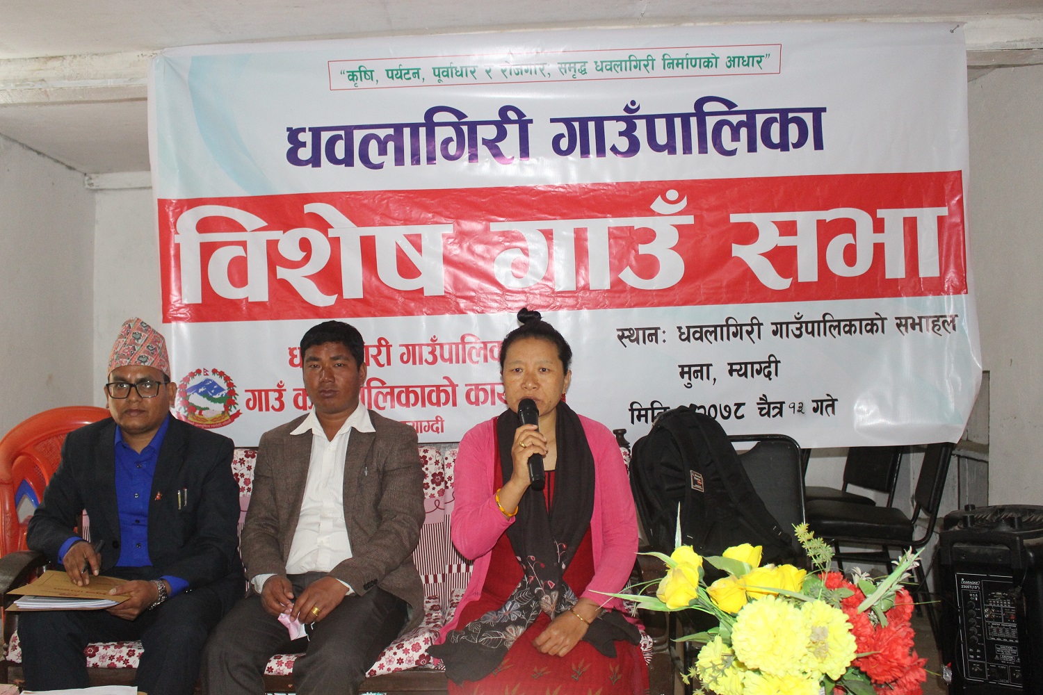 म्याग्दी, १३ चैत । म्याग्दीको धवलागिरी गाउँपालिकाको आइतबार मुनामा भएको विशेष गाउँसभाबाट शिक्षा ऐन र योजना संसोधन भएको छ । गाउँपालिका अध्यक्ष थमसरा पुनले सभामा पेश गर्नुभएको प्रस्ताव छलफल पछि पारित भएको हो । धवलागिरी गाउँपालिकाको शिक्षा ऐन–२०७६ र योजनाको नाम तथा बजेट संसोधन गर्ने प्रस्ताव पारित भएको हो ।