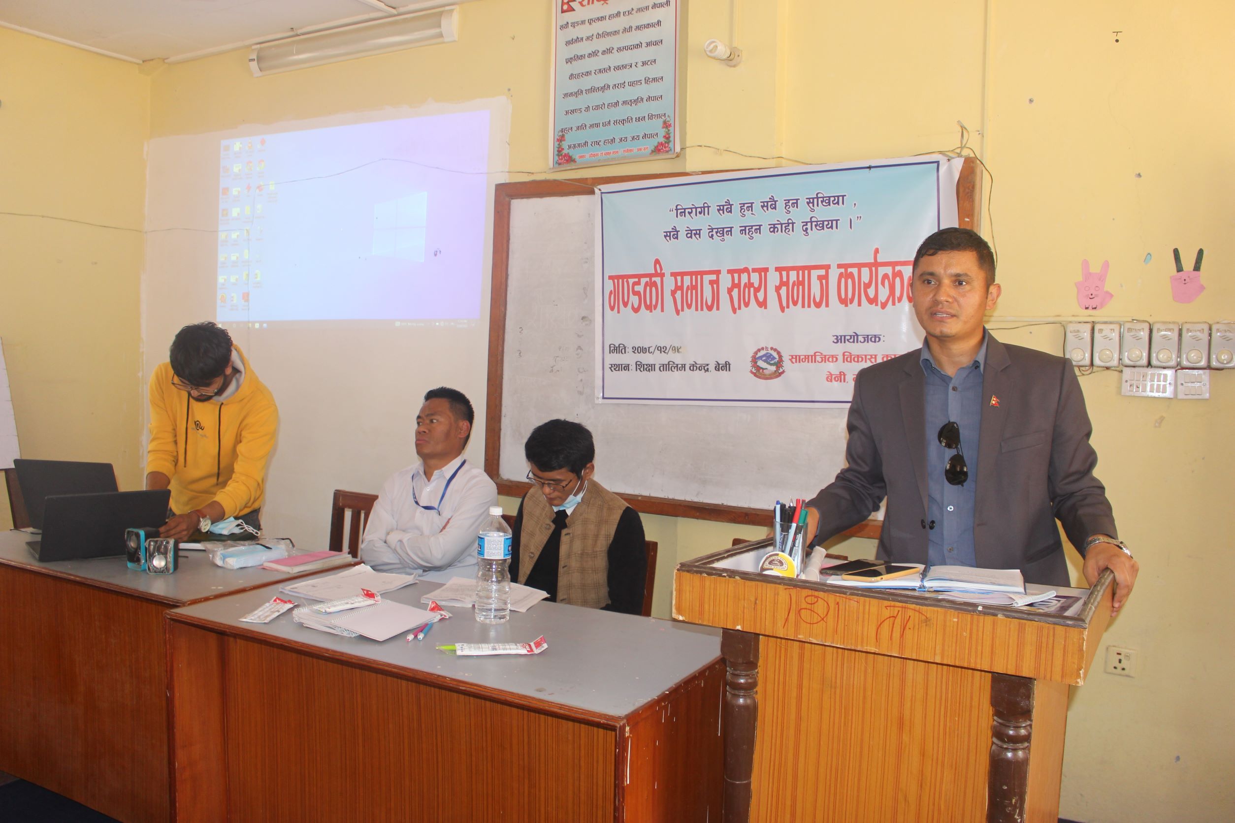 जिल्ला सरकारी वकिल कार्यालय म्याग्दीका न्यायाधिबक्ता धर्मराज पौडेलले सरकारी वकिल कार्यालयको भूमिका र कानुन सम्वन्धी, शिक्षा विकास तथा समन्वय ईकाईका समन्वय प्रमुख दलबहादुर थापाले जिल्लाको शिक्षाको अवस्था सम्वन्धी, गैसस म्याग्दीका निर्वतमान अध्यक्ष हरिप्रसाद पौडेलल सामाजिक संस्थाको भूमिकाबारे र कार्यालय प्रमुख थापाले सामाजिक कुरिति, अन्धविश्वास र छुवाछुत विषयमा जानकारी गराउनुभएको थियो ।