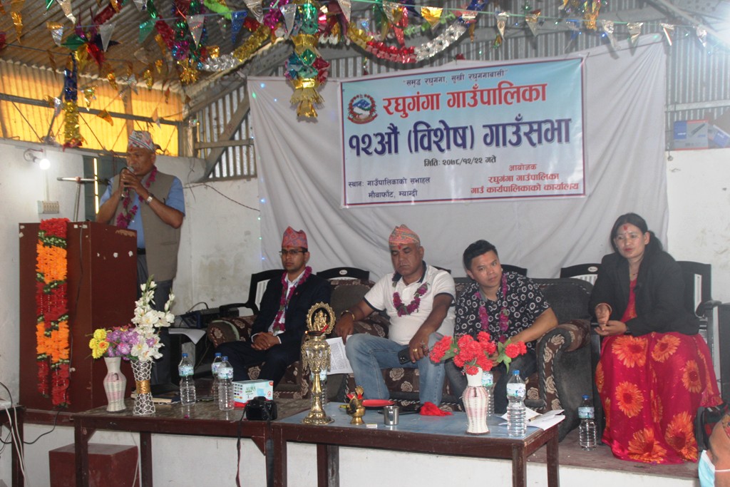 म्याग्दी २३ चैत । म्याग्दीको रघुगंगा गाउँपालिकाको १२ औँ (बिशेष)गाउँसभाबाट करिब एक दर्जन ऐन, कार्यविधि र नियमावली पारित भएको छ । मंगलवार गाउँपालिकाको केन्द्र मौवाफाँटमा सम्पन्न बिशेष गाउँसभाले केहि योजना संसोधन र विनियोजन सहित विभिन्न ऐन, कार्यविधि र नियमावलीहरु पारित गरेको हो ।