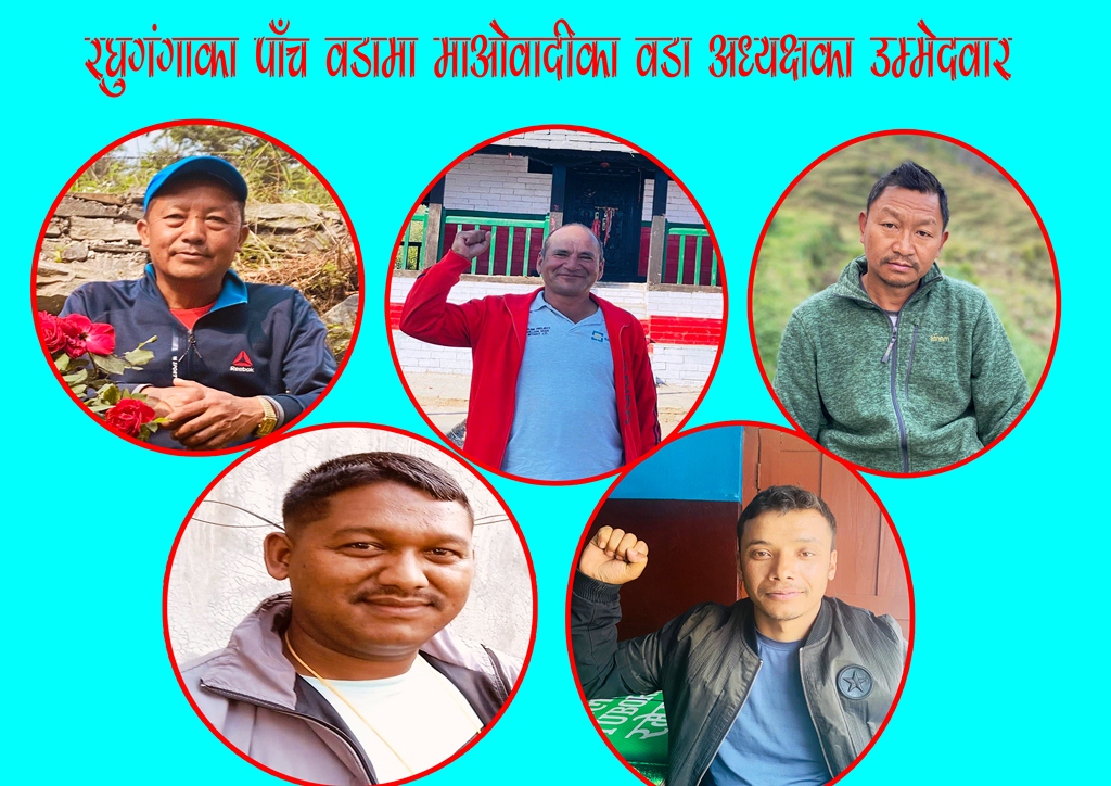 माओवादी केन्द्रबाट बेगमा भविन्द्र शेरपुञ्जा, भगवतीमा नरबहादुर भण्डारी, दग्नाममा बि प्रसाद पुन, पाखापानीमा सन्तोष विक र कुइनेमंगलेमा चित्र घर्तिलाई वडा अध्यक्षको उम्मेदवार छनोट गरिएको नेकपा माओवादी केन्द्र रघुगंगा गाउँपालिका कमिटीका अध्यक्ष हरि भण्डारीले जानकारी दिनुभयो ।
