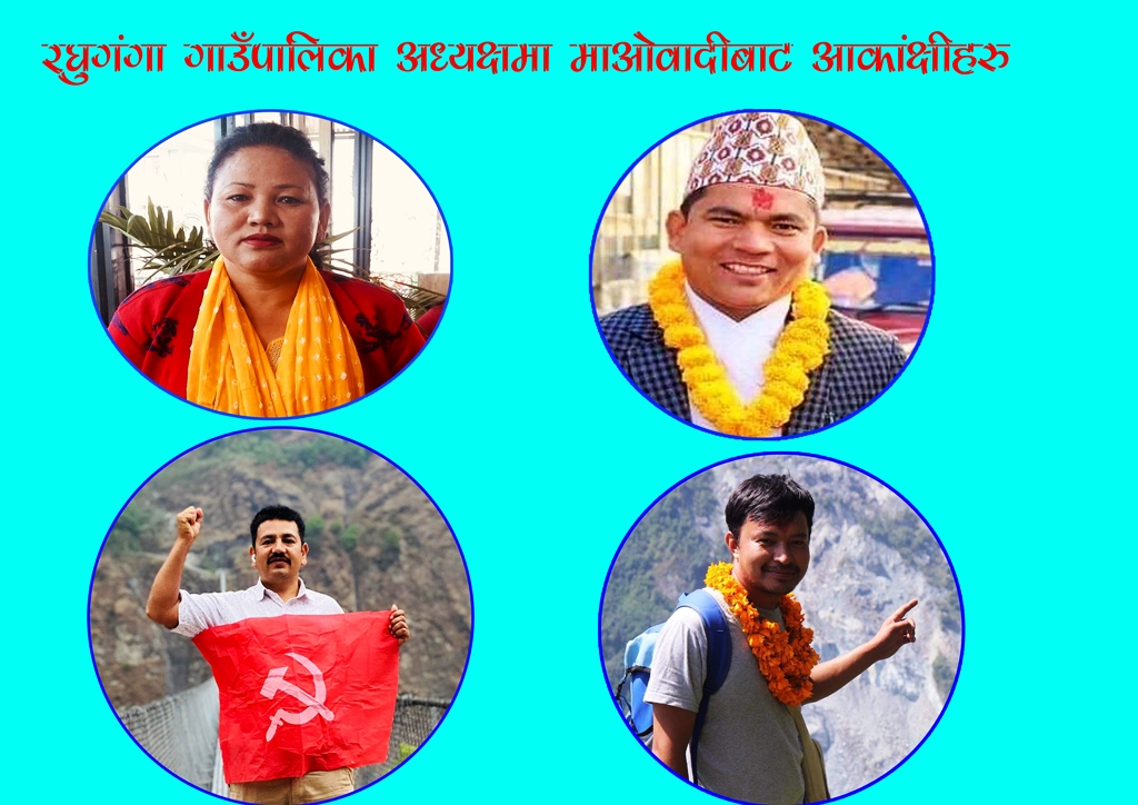 म्याग्दी, ६ वैशाख । आगामी वैशाख ३० गते हुने स्थानीय तह निर्वाचनमा म्याग्दीको रघुगंगा गाउँपालिकामा नेकपा (माओवादी केन्द्र) बाट गाउँपालिका अध्यक्ष पदको उम्मेदवारमा चार जनाले आकांक्षा राखेका छन् । पार्टीको गाउँपालिका कमिटीमा गाउँपालिका अध्यक्ष पदको उम्मेदवार बन्न बिश्व सेन मल्ल, रिम कटुवाल, हरि भण्डारी र सुविन शेरपुञ्जाले आकांक्षा राख्नुभएको हो ।