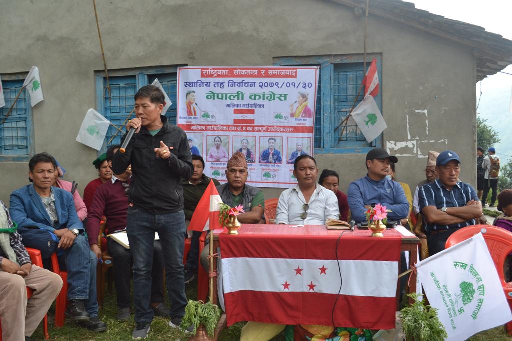 म्याग्दी, २२ बैशाख । नेपाली कांग्रेसले जिल्लाको मालिका गाउँपालिका वडा नम्बर ४ च्युरीबोटमा चुनावी कार्यक्रम गरेको छ । बुधबार च्युरीबोट आयोजित कार्यक्रममा उम्मेद्धारीहरुले सुशासन सहित समृद्ध गाउँपालिका निर्माण गर्न आफुहरुलाई भोट दिन आह्वान गरेका छन् । कार्यक्रमलाई कांग्रेस म्याग्दीका उपसभापति केबी भण्डारीले सम्बोधन गर्दै सुशासन सहितको समृद्धको लागि कांग्रेसका उम्मेद्धारहरुलाई मतदान गर्न अपिल गर्नुभयो ।