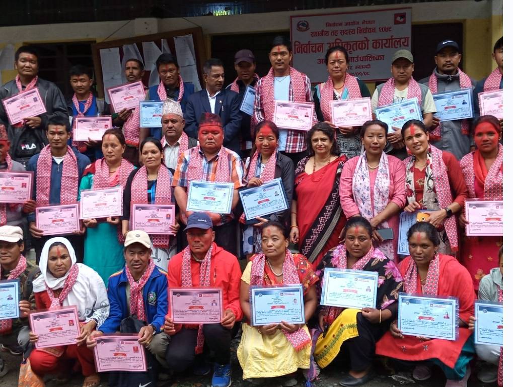 म्याग्दी,१२ जेठ । अन्नपूर्ण गाउँपालिकाका नवनिर्वाचित जनप्रतिनिधीहरुले बुधबार सपथग्रहणसंगै पदभार ग्रहण गरेका छन् । गाउँपालिकाका अध्यक्ष भारतप्रसाद पुनलाई मुख्य निर्वाचन अधिकृत तेजनारायण पौडेलले पद तथा गोपनीयताको सपथ ग्रहण गराउनुभएको थियो । अध्यक्ष पुनले उपाध्यक्ष दिवा तिलिजा पुन, आठ वटै वडाका अध्यक्ष र सदस्यहरुलाई सपथ ग्रहण गराउनुभएको हो ।