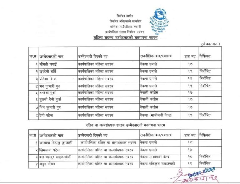कार्यपालिका सदस्यमा नेकपा एमालेबाट छरदेवी घर्ति, प्रतिक्षा विक, मनकुमारी पुन निर्वाचित भएका छन् भने, नेकपा माओवादी केन्द्रबाट देवी पटेल, दलबहादुर खड्काथोकी र एकीकृत समाजबादीबाट अनुप गौचन निर्वाचित भएको निर्वाचन अधिकृतको कार्यालयले जानकारी दिएको छ ।