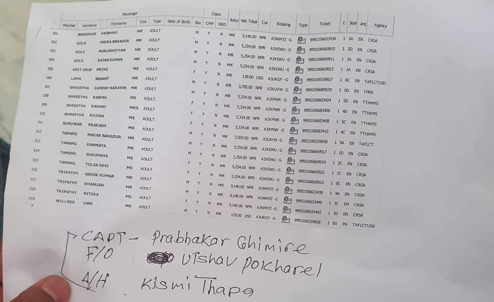 विमानमा इन्द्र बहादुर गोले, पुरुषोत्तम गोले, राजन कुमार गोले, मिक ग्र्याट, बसन्त लामा, गणेश नारायण श्रेष्ठ, रवीना श्रेष्ठ, रस्मी श्रेष्ठ, रोजिना श्रेष्ठ, प्रकाश सुनुवार, मकर बहादुर तामाङ, राममाया तामाङ, सुकुमाया तामाङ, तुल्सादेवी तामाङ, अशोक कुमार त्रिपाठी, धनुष त्रिपाठी, ऋतिका त्रिपाठी, युवी विल्नर र वैभवी बाण्डेकर सवार थिए ।