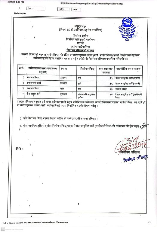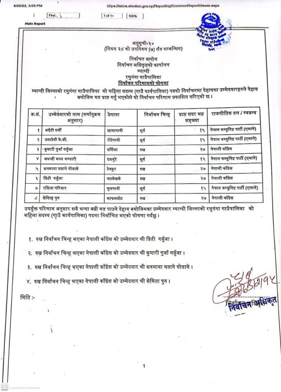 निर्वाचनमा गठबन्धनका उम्मेदवारले २७ मत प्राप्त गर्दा प्रतिस्पर्धी नेकपा एमालेका उम्मेदवारले १५ मत प्राप्त गरेका छन् । रघुगंगामा नेपाली कांग्रसको २७ जना र नेकपा एमालेको १५ जना मतदाता छन् ।