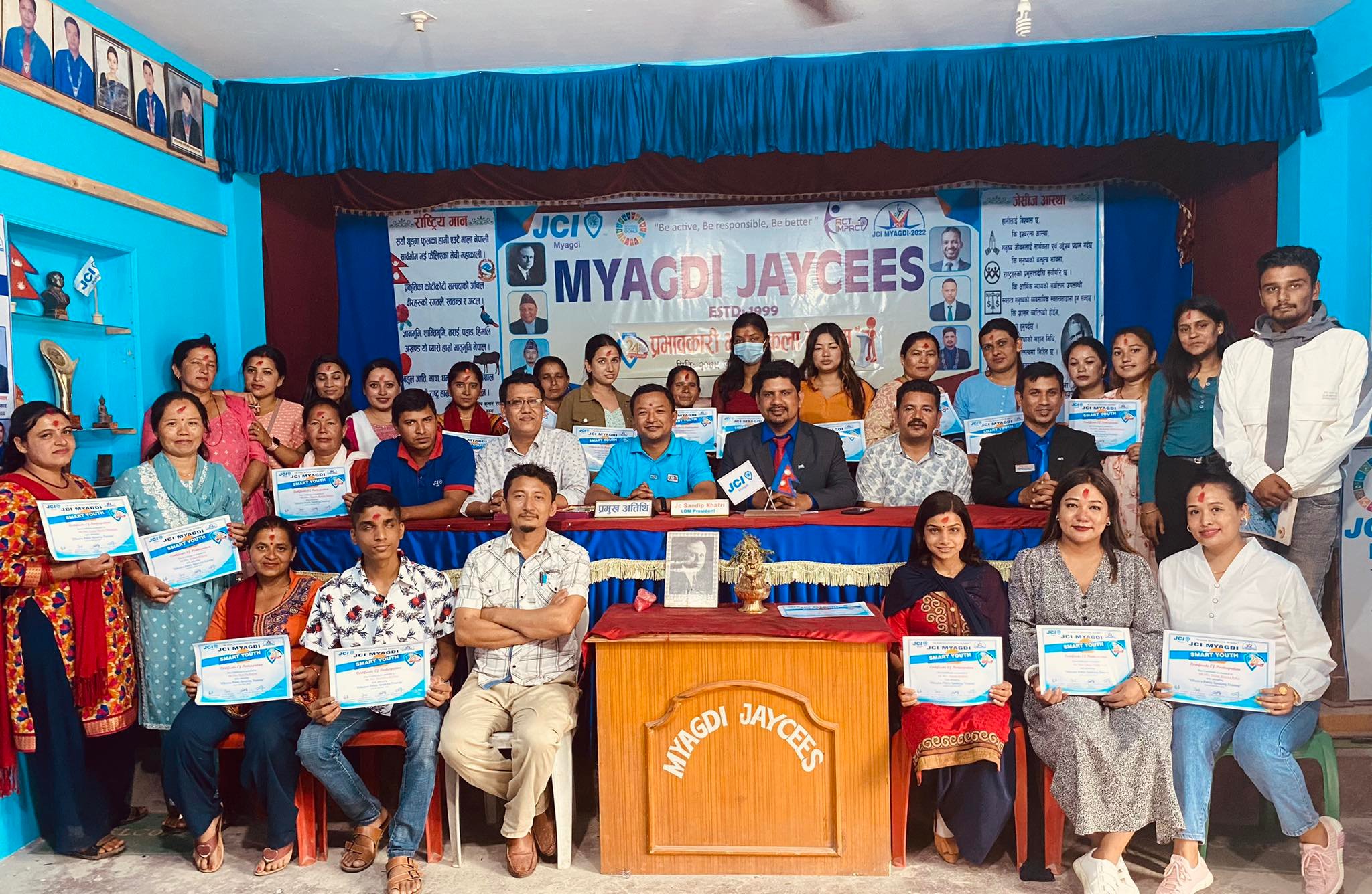 म्याग्दी जेसिजका अध्यक्ष सन्दिप खत्रीले नयाँ पिँढी तथा युवाहरु बोल्न लजाउने र कसरी बोल्ने, भाषण गर्ने भन्ने विषयमा राम्रो जानकार छैनन् त्यसकारण समाजमा युवाहरुको नेतृत्व विकास गराउन जेसिज सप्ताह अन्तरगत सार्वजनिक भाषणकला तालिम गरेको बताउनुभयो । अध्यक्ष खत्रीको अध्यक्षता, कोषाध्यक्ष सुमन बाँनियाको स्वागत मन्तव्य, तालिम संयोजक कृष्णप्रसाद पौडेलले संचालनमा सम्पन्न तालिमा म्याग्दी जेसिजका पुर्वअध्यक्ष एवम् सदस्यहरुको सहभागिता रहेको थियो । तालिममा सहभागिलाई प्रमाणपत्र वितरण गरिएको थियो ।