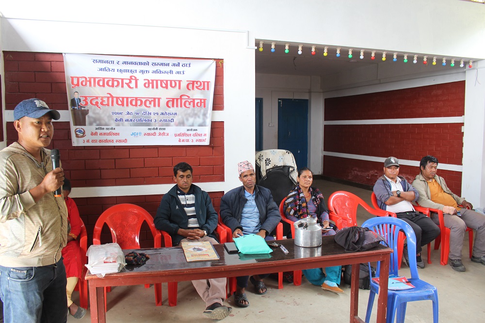 बेनी, २० जेठ । म्याग्दीको बेनी नगरपालिका–३ भकिम्लीमा बिहिबारदेखि उद्घोषण तथा भाषणकला तालिम शुरु भएको छ । बेनी नगरपालिका वडा नम्बर ३ को आर्थिक सहयोग र म्याग्दी जेसिजसँगको सहकार्यमा प्रगतिशिल दलित मञ्चले आयोजना गरेको तालिमको वडा सदस्य रत्नबहादुर जिसीले उद्घाटन गर्नुभयो ।