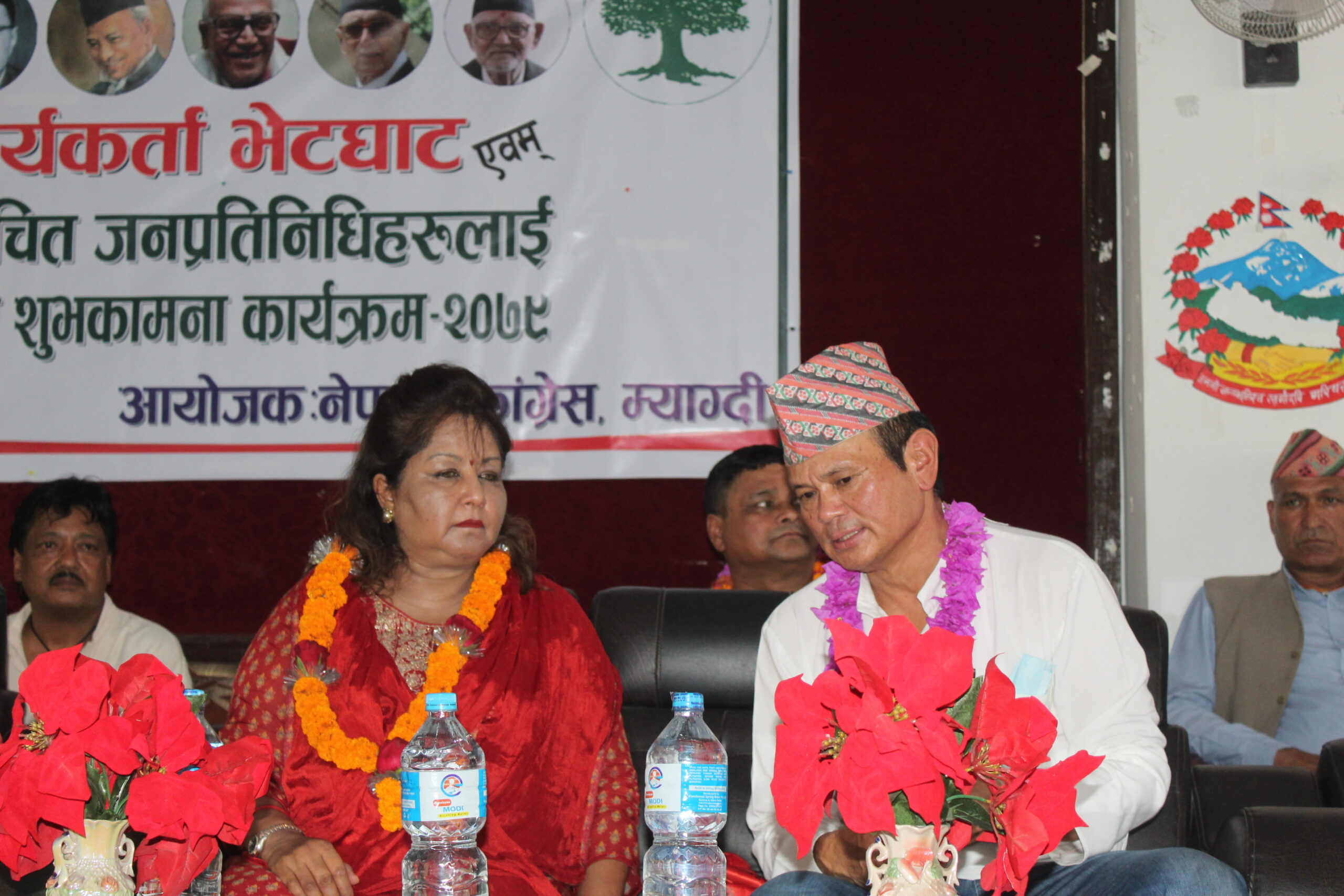 बुधवार नेपाली कांग्रेस जिल्ला कार्य समिति म्याग्दीले आयोजना गरेको कार्यकर्ता भेटघाट तथा नवनिर्वाचित जनप्रतिनिधिहरुलाई बधाई तथा शुभकामना कार्यक्रम २०७९ को अवसरमा पाटीभित्रको समस्या र जनता समस्या समाधान लाग्न निर्देशन दिनुभएको हो । काँग्रेसबाट निर्वाचित भएका जनप्रतिनिधिलाई पाँच वर्षमा हरेक समयमा जनताको साथ दिन आग्रह गर्दै जनताका समस्यालाई प्राथमिकतामा राखेर काम गर्न आग्रह गर्नुभएको छ ।