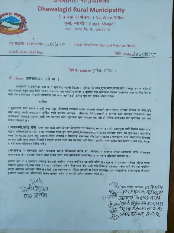 म्याग्दी, ९ साउन । म्याग्दीको धवलागिरी गाउँपालिका– १ गुर्जामा जुवातास बन्द गर्ने निर्णयलाई आगामी दिनमा निरन्तर कार्यान्वयन गरिने भएको छ । सोमबार गुर्जामा बसेको वडाका जनप्रतिनिधिहरुको बैठकले वडामा जुवातास बन्द र विहान ५ बजेदेखि बेलुका ५ बजेसम्म मदिरा सेवन नगर्ने निर्णयलाई आगामी दिनमा निरन्तर कार्यान्वयन गरिने निर्णय गरेको हो ।