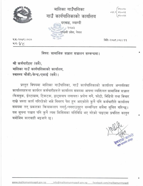 म्याग्दी, ११ साउन । म्याग्दीको मालिका गाउँपालिकामा कार्यालय समयमा कर्मचारीलाई सामाजिक सञ्जाल चलाउन रोक लगाईएको छ ।