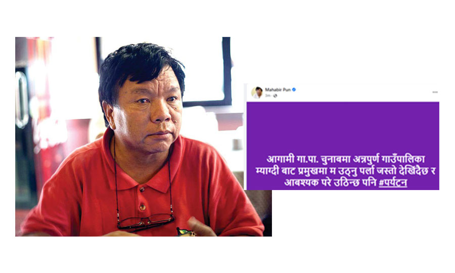 सामाजिक सञ्जाल फेसबुकमार्फत संकेत गर्दै पुनले लेखेका छन् ,‘आगामी गा.पा चुनावमा अन्नपुर्ण गाउँपालिका म्याग्दीबाट प्रमुखमा उठ्नुपर्ला जस्तो देखिँदैछ र आवश्यक परे उठिन्छ पनि ।’