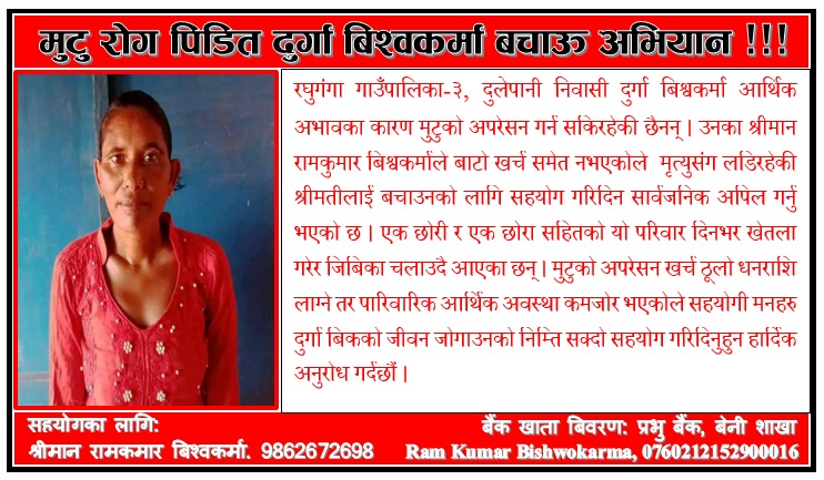 ‘मुटु रोगकी पीडित दुर्गाका श्रीमान राम कुमार विश्वकर्माले खेती किसानी र ज्याला मजदुरीबाट दुई छोराछोरी रहेको घरपरिवारको जिविकोपार्जन र औषधी उपचार गरिरहेका छन् । ३६ बर्षकी श्रीमतीलाई मुटुमा थप जटिलता थपिदै गएपछि डाक्टरले अप्रेसन गर्न भनेको छ, उक्त मुटुको उपचार खर्चमा ठुलो रकम लाग्ने भएपछि सहयोगको अपिल गरिरहेको छु’– श्रीमाने विकले भन्नुभयो ।