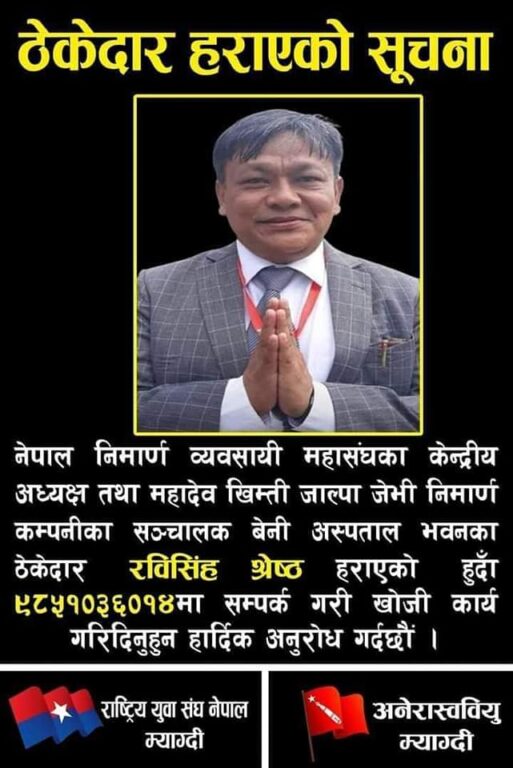 अनेरास्ववियु गण्डकी प्रदेश अध्यक्ष पौडेल, केन्द्रीय सचिबालय सदस्य सुवास विक, युवा संघका जिल्ला अध्यक्ष शिशिर शाही लगायतको नेतृत्वमा गएका युवा तथा विद्यार्थी नेताहरुले भित्ता र विजुलीको पोलमा निर्माण व्यवसायि श्रेष्ठको तस्विर र सम्पर्क नम्बर समेत उल्लेख गरी निर्माण व्यवसायी हराएको सूचना टाँस गरेका छन् । तत्कालिन शहरी विकास तथा भवन निर्माण डिभिजन कार्यालय बागलुङसंग २०७३ पुस २१ मा महादेव खिम्ती, गल्वा रफिना जेभीले रु १८ करोड ८४ लाख ८ हजार ८९ मा ठेक्का सम्झौता गरेको थियो । २०७६ मंसिर २० गते भित्र निर्माण कार्य सम्पन्न गर्ने सम्झौता भएपनि योजना अलपत्र परेपछि अहिले चौतर्फि आलोचना र गुनासो बढेको छ ।