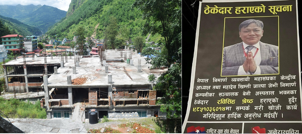 म्याग्दी, २० भदौ । ५० वेड क्षमतामा स्तरोन्नती सहित निर्माणधिन बेनी अस्पतालको भवन अलपत्र पार्ने निर्माण कम्पनी र सरोकारवालालाई दबाब दिन निर्माण व्यवसायीको खोजी गर्न दबाब मुलक विरोध प्रदर्शन भएको छ । नेकपा एमाले निकट अनेरास्ववियु र युवा संघ म्याग्दीले अस्पतालको भवन अलपत्र पार्ने निर्माण व्यवसायी हराएको सूचना सहितको तस्विरलाई सार्वजनिक स्थानमा टाँसेर विरोध पदर्शन गरेका हुन् ।