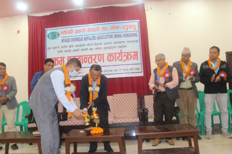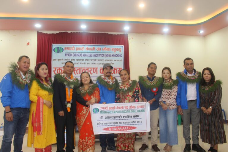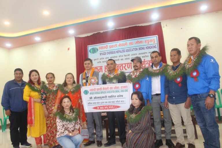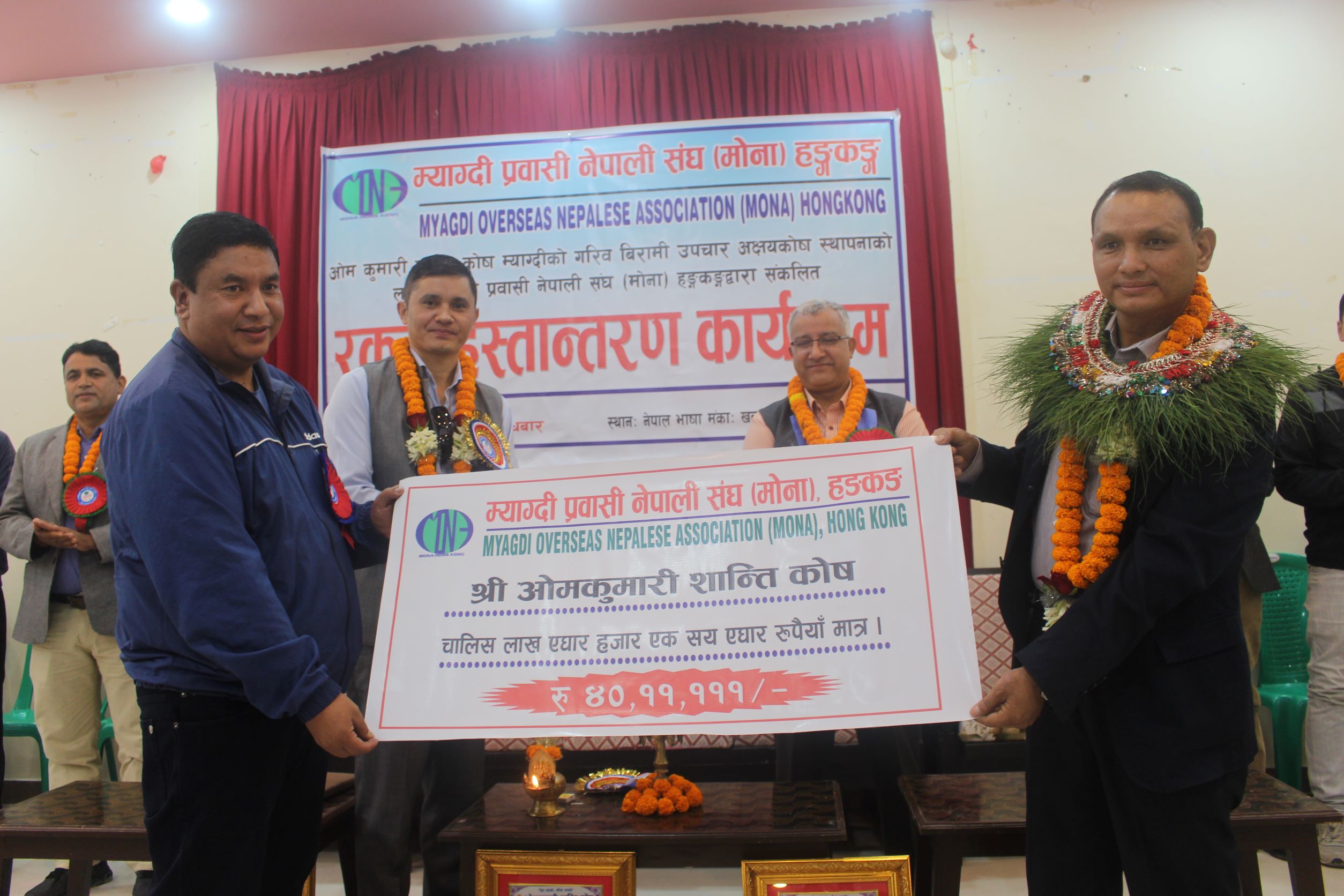 म्याग्दी, २५ असोज । रोजगार र अध्ययनको शिलशिलामा हङकङमा रहेका म्याग्देलीहरुको साझा संस्था म्याग्दी प्रवासी नेपाली संघ (मोना) हङकङले आर्थिक अवस्था कमजोर भएका म्याग्देलीहरुको उपचारमा सघाउन अक्षकोषमा ४० लाख रुपैया आर्थिक सहयोग गरेका छन् । परोपकारी क्षेत्रमा क्रियाशिल ओमकुमारी शान्ति कोषले आर्थिक रुपमा कमजोर भएका जिल्लाबासीको उपचारमा सघाउन स्थापना गरेको अक्षयकोषमा मोना हङकङले रु ४० लाख ११ हाजर १११ आर्थिक सहयोग गरेको हो ।