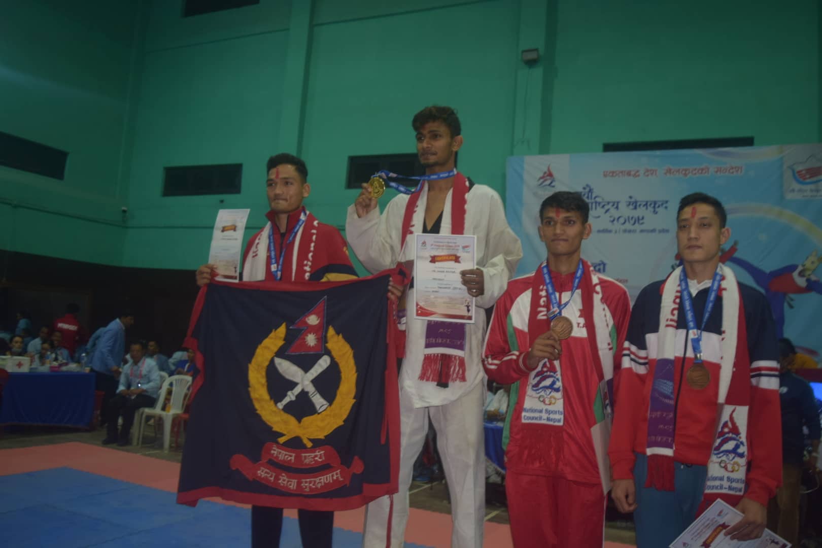 राष्ट्रिय खेलकुद परिषद्का तेक्वान्दो प्रशिक्षक हिरा थापाले प्रहरीका निशा दर्नाल महिला र कमल श्रेष्ठले एकल पुम्सेमा स्वर्ण पदक जितेका जानकारी दिनुभयो । महिलातर्फ नेपाली सेनाकी स्वतिका तामाङ रजत, प्रदेश १ की शुशिला राई र गण्डकीकी अर्पण अधिकारीले कास्य पदक जितेका छन् ।