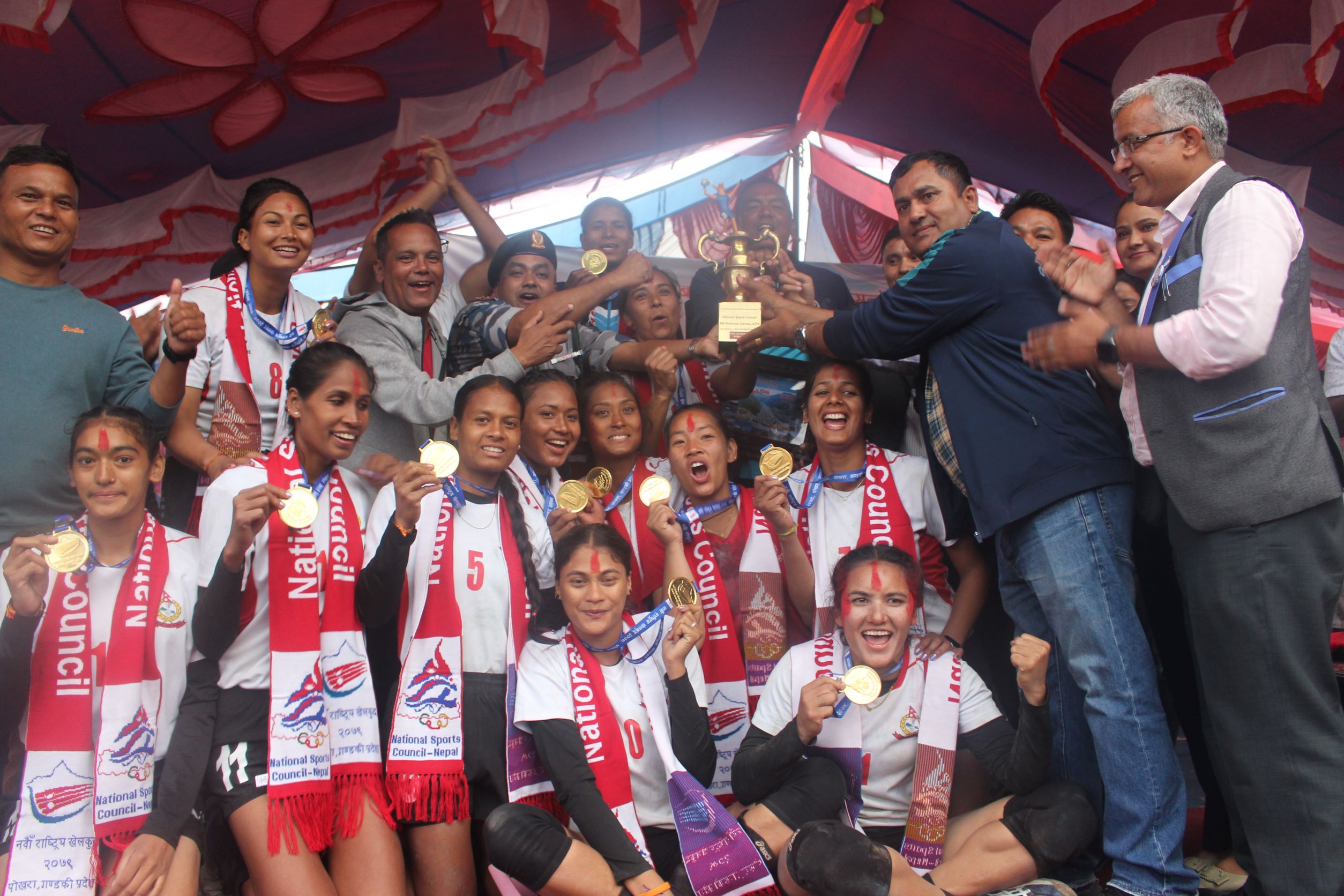 म्याग्दी, २ कात्तिक । नवौं राष्ट्रिय खेलकुद प्रतियोगिता अन्तरगत म्याग्दीको सदरमुकाम बेनीमा आज सम्पन्न राष्ट्रिय महिला भलिवल प्रतियोागितामा सशस्त्र प्रहरीको एपिएफ क्लबलाई स्वर्ण जितेको छ । प्रतिस्पर्धात्मक फाइनलमा नेपाल पुलिस क्लबलाई १ का विरुद्ध तीन सेटमा पराजीत गर्दै राष्ट्रिय महिला भलिबलमा एपिएफ क्लबले स्वर्ण जितेको हो ।