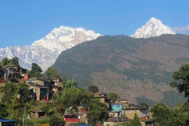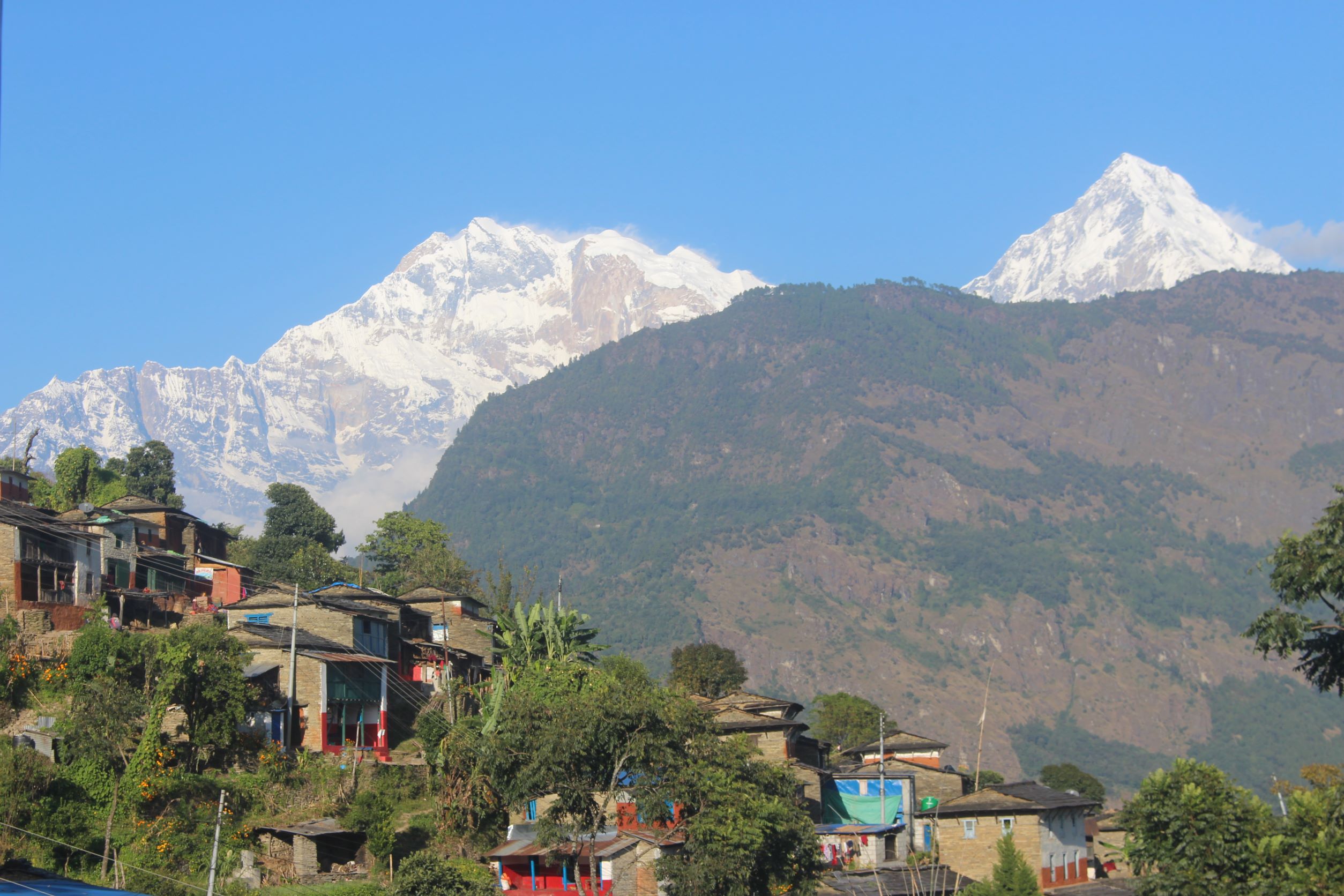 म्याग्दी, ९ असोज । म्याग्दीको रघुगंगा गाउँपालिका वडा नम्बर २ को राखु हटियाँ गाउँ र पृष्ठभूमिमा देखिएको निलगिरी र अन्नपूर्ण हिमाल । तस्विर : धिरन खत्री.