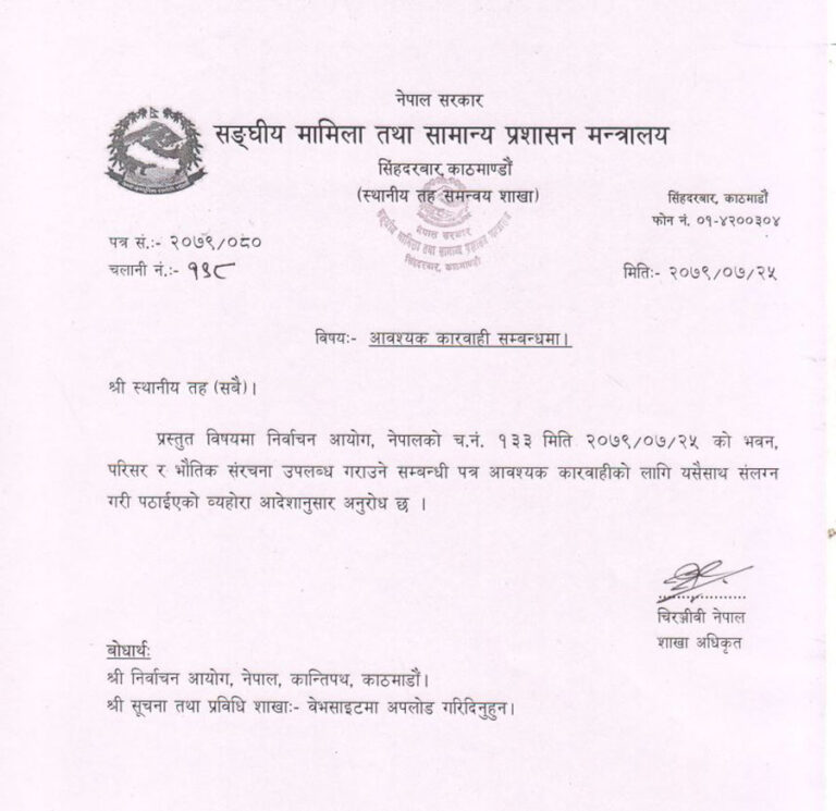 निर्वाचन आयोगले चुनावका लागि आवश्यक पर्ने भवन, परिसर र भौतिक संरचनाको व्यवस्थापन गरिदिन भन्दै मन्त्रालयमा परिपत्र गरेको थियो । सोही परिपत्र अनुसार निर्वाचनका लागि आवश्यक पर्ने भौतिक संरचनाहरुको व्यवस्थापन गरिदिन स्थानीय तहहरुलाई पत्राचार गरिएको सामान्य प्रशासन मन्त्रालयका शाखा अधिकृत चिरञ्जीवी नेपालले जानकारी दिए ।