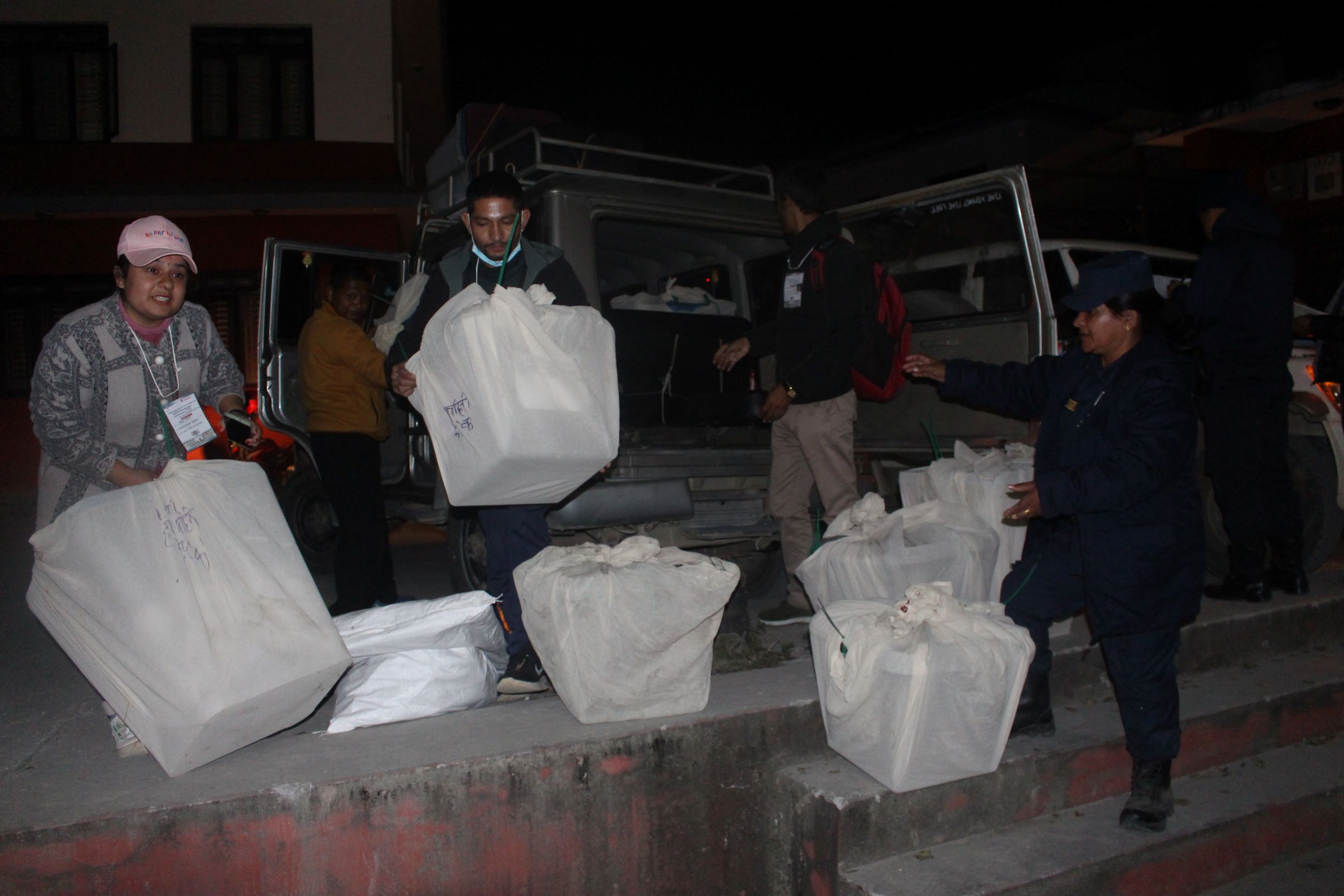 मतदान केन्द्रमा खटिएका मतदान अधिकृत र सुरक्षाकर्मी सहितको टोलीले मतपेटिका मुख्य निर्वाचन अधिकृतको कार्यालयमा ल्याउन थालेका छन् ।